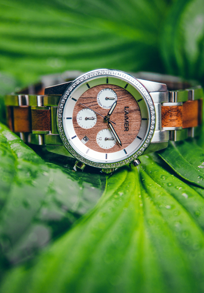 كرونوغراف نسائي يجمع بين الفخامة والمظهر الرياضي بخشب الجوز مع ستيل فضي وفصوص سوارفسكي الأصلية