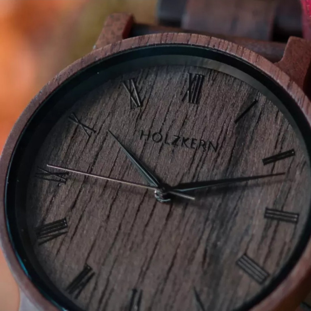 ساعة رجالية بخشب الجوز مع مينا خشب غامق وأرقام رومانية