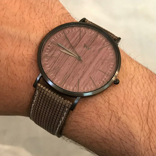 ساعة رجالية نحيفة ورسمية بإطار ستيل رمادي غامق، مع اسورة بتقنية الخشب المرن
