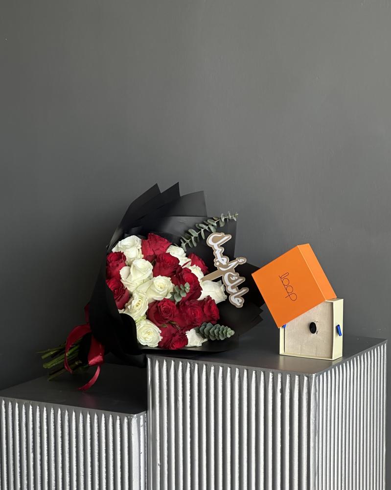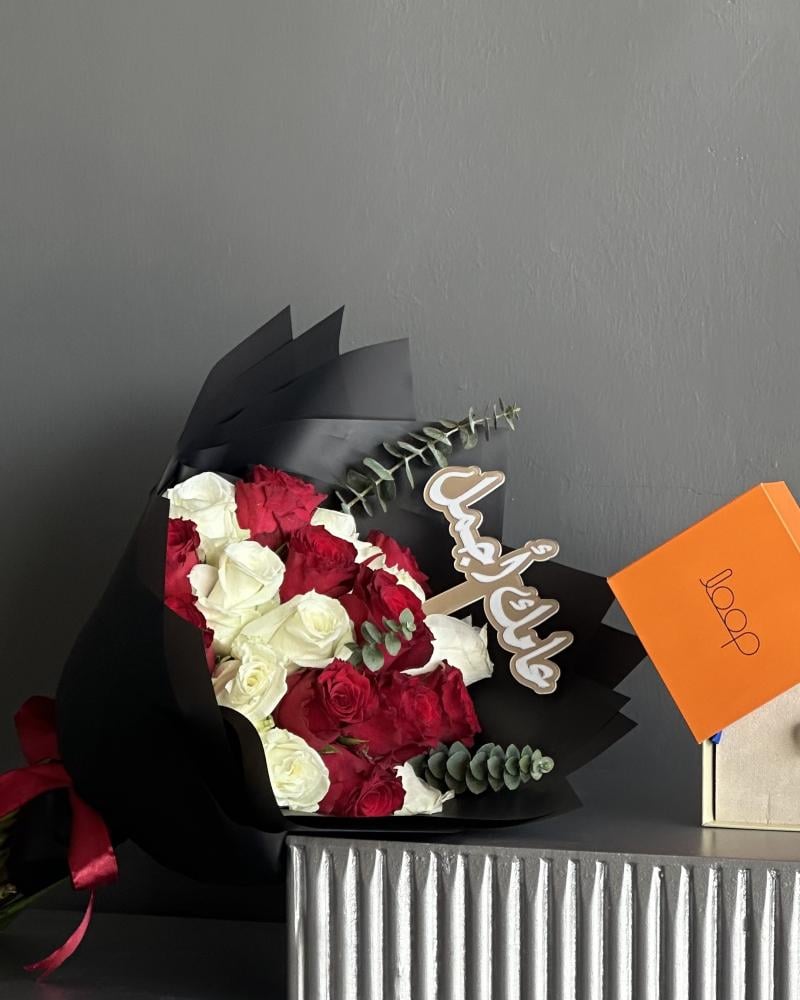 • باقة ورد جوري أحمر وأبيض بتغليف أسود فخم وربطة ساتان