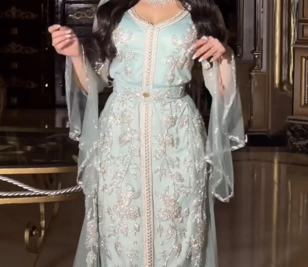 قفطان مغربي بقماش الكريب والتل مشكوك بالخرز والكريستال