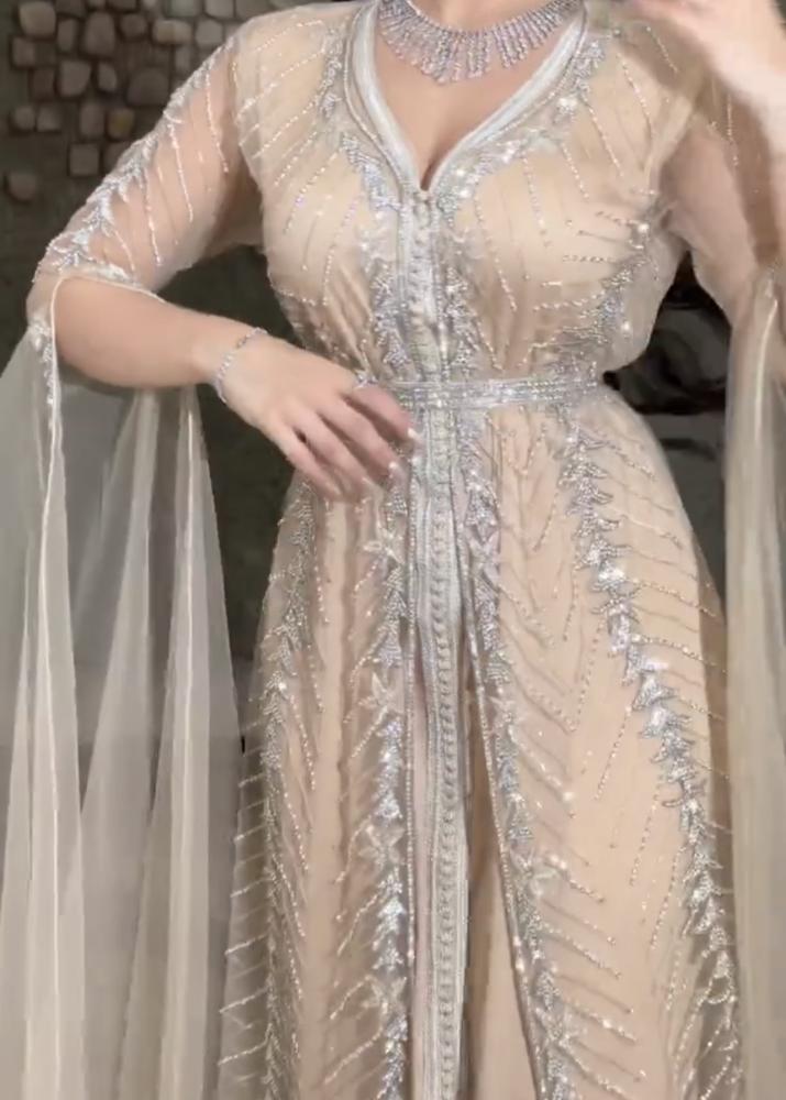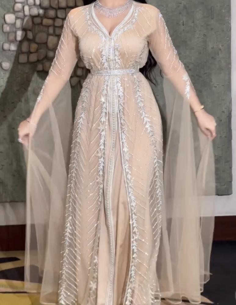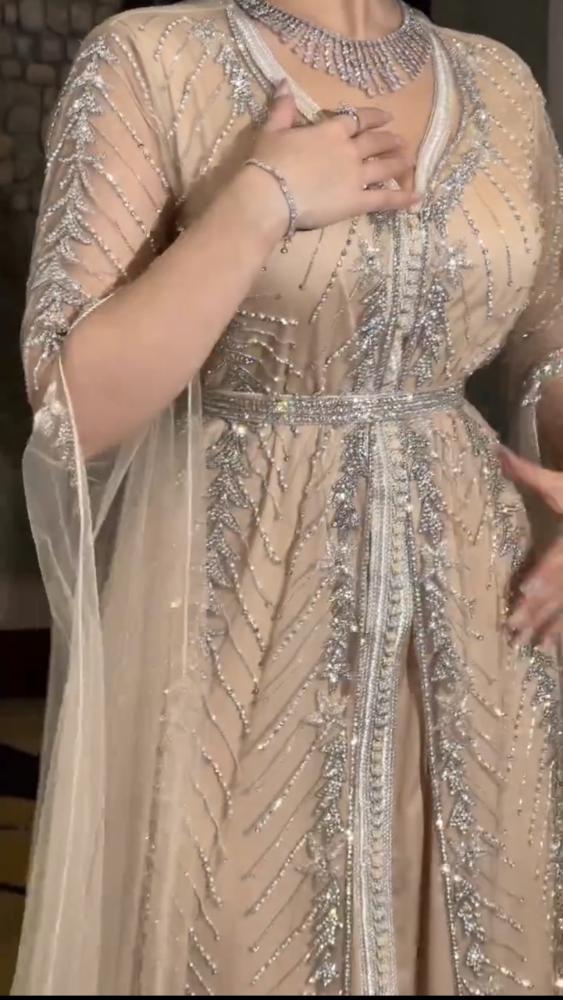 قفطان مغربي بقماش الكريب والتل المشكوك بالخرز والكريستال