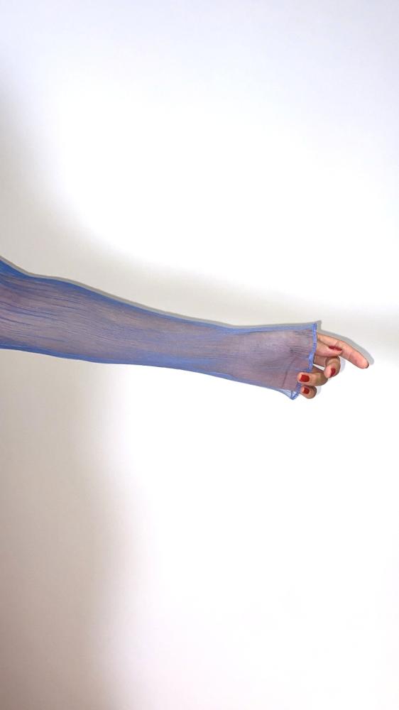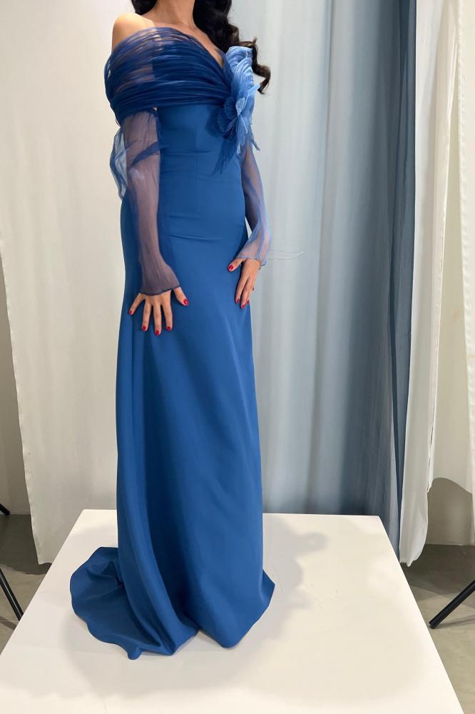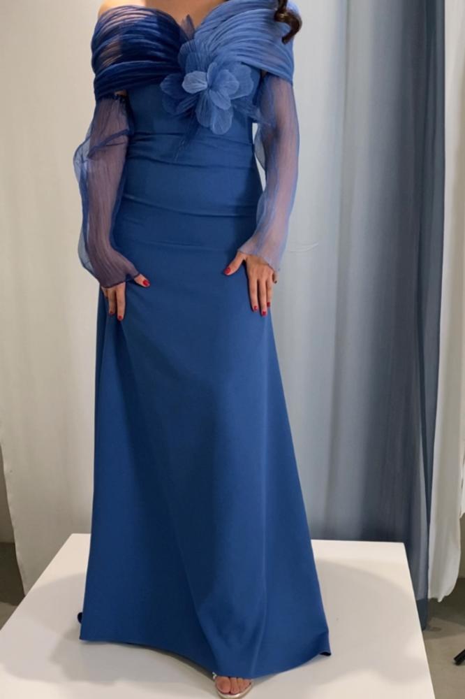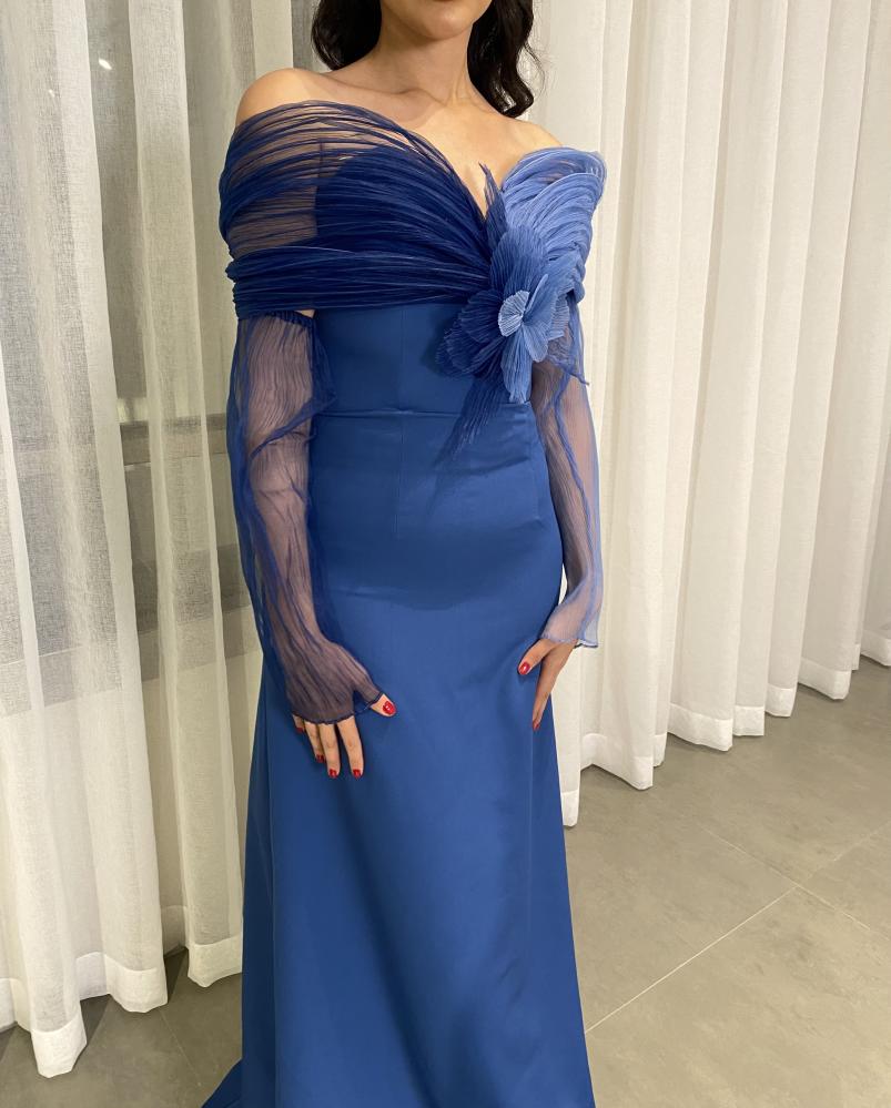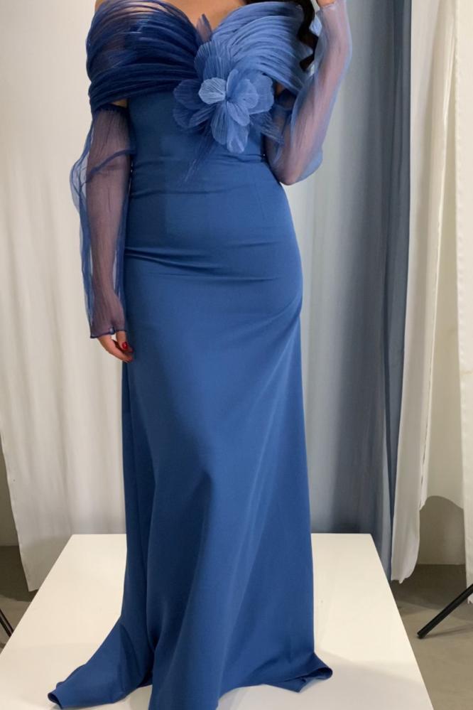 موج البحر الأحمر فستان أزرق قصة A-line مع ذيل، من أجود أقمشة الكريب الفاخر، مع ورد الجازار الجذاب بالمنتصف، مع قماش جازار بلاسيه المدرج من الأزرق الفاتح إلى الأزرق الغامق أيضاً للأكمام، كذلك الكم قطعة منفصلة.