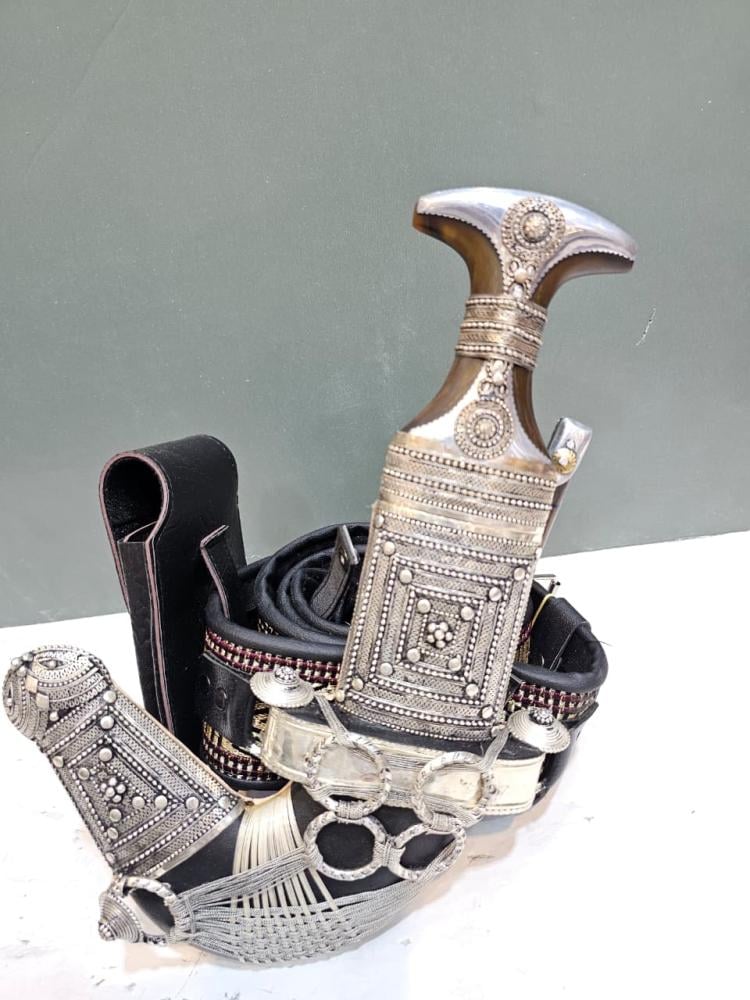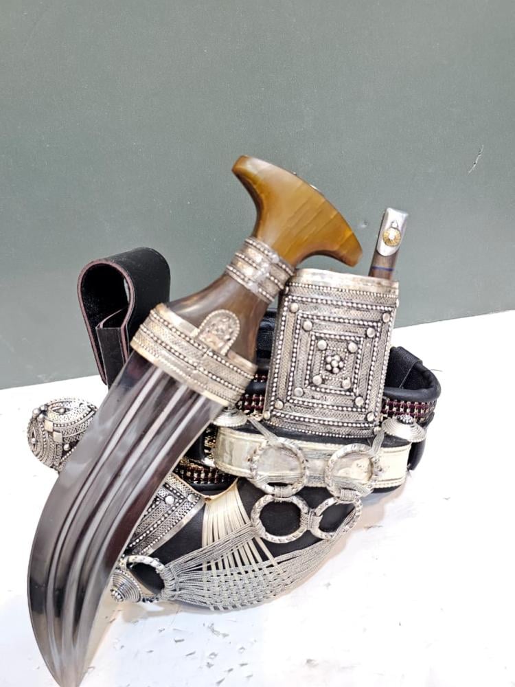 خنجر فضه رأس قرن طبيعي جواميس شبيه الزراف سله تفصيل تقص المسمار ألراس مطرح 5 عرض الخنجر صب رقم 8 سم طول الحزام 120 سم والعرض 8 سم
