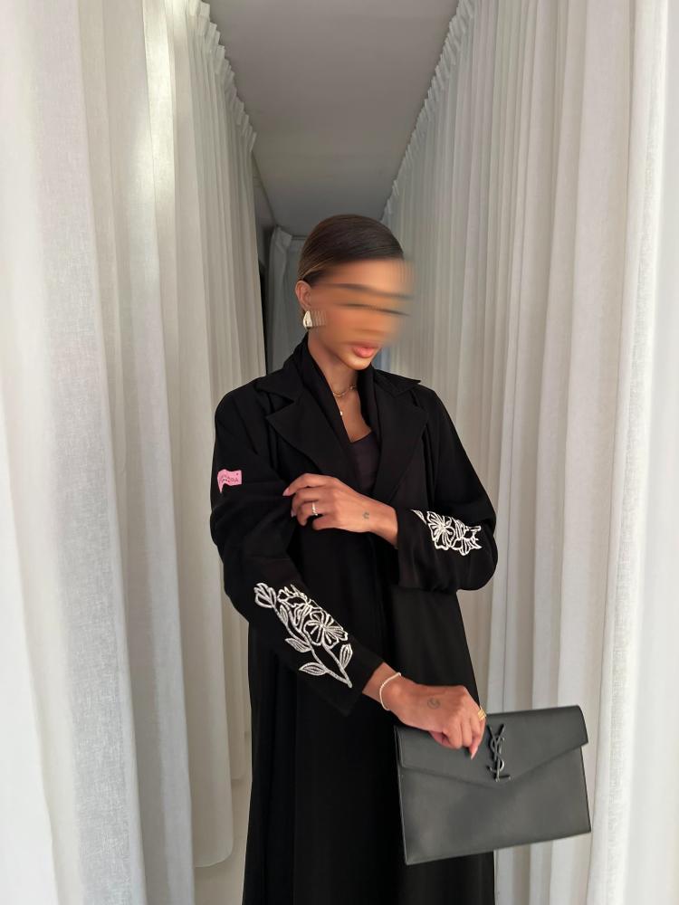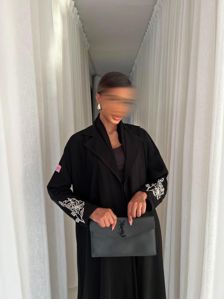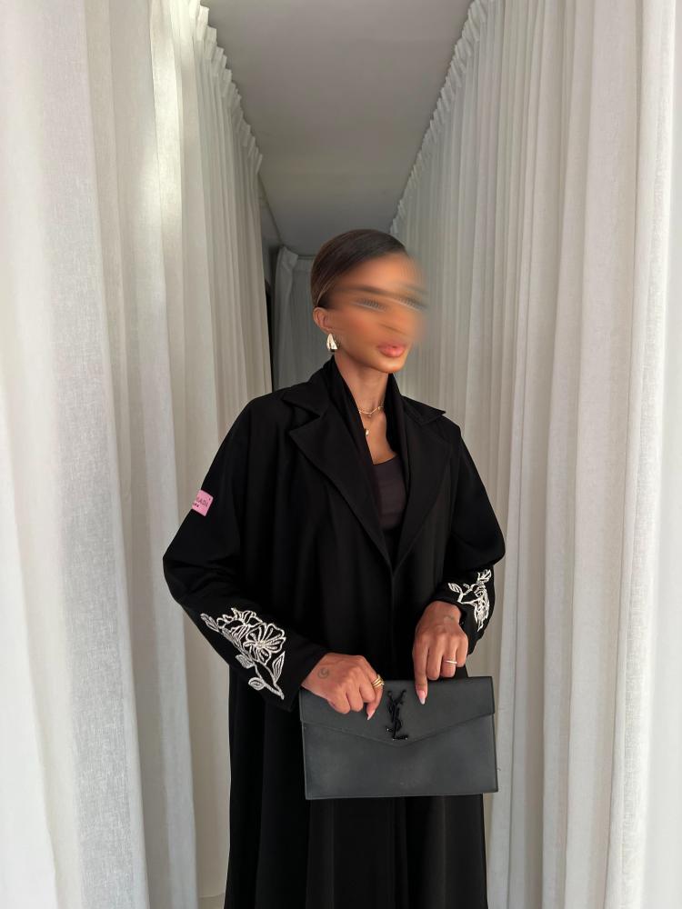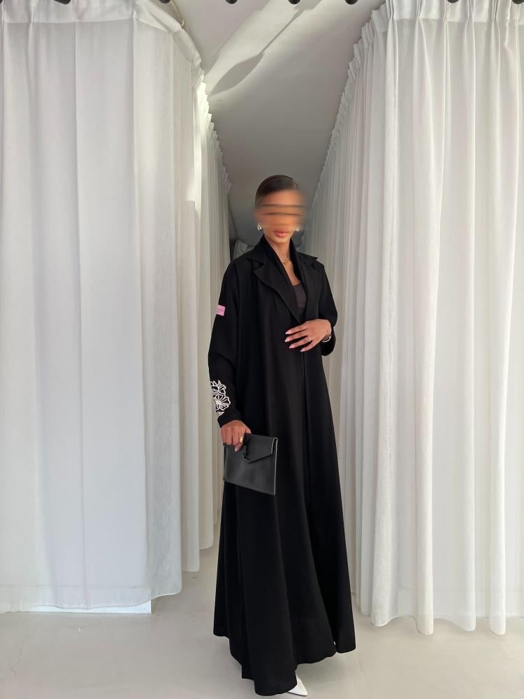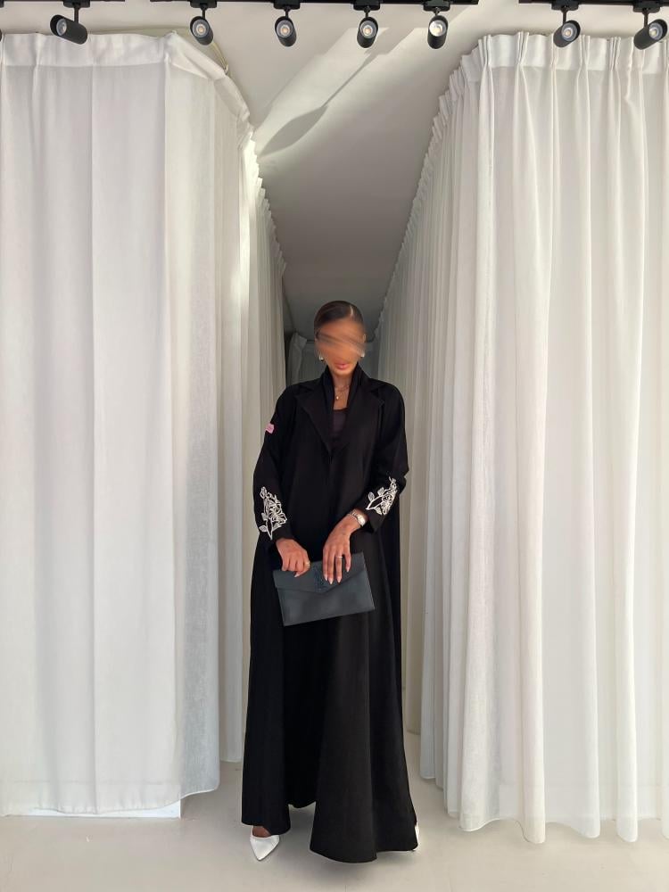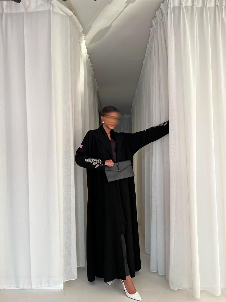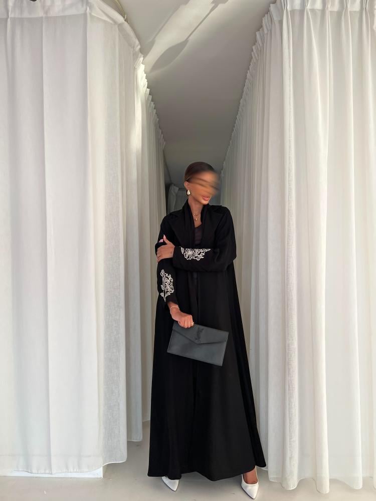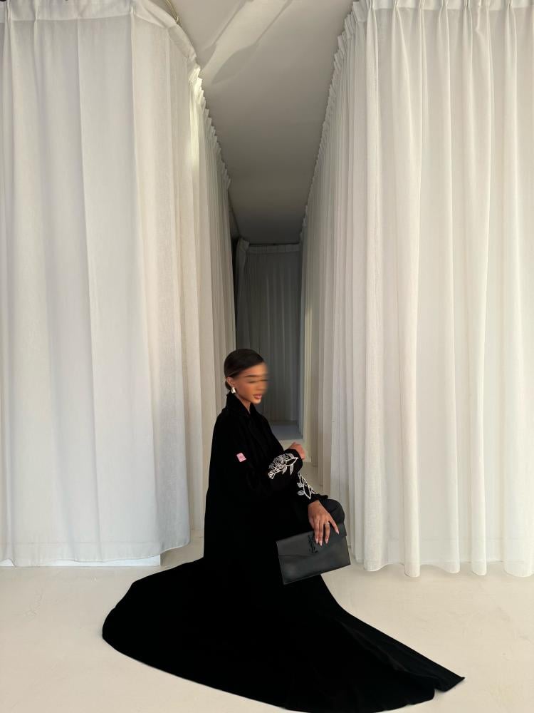 نوع القماش : كريب اسود سادة + كريب مطرز مورد خيوط قصب فضي ✨