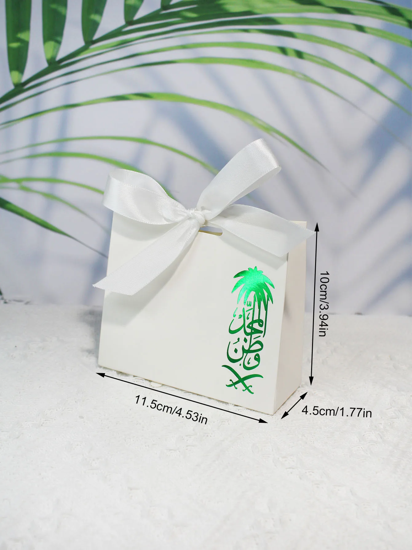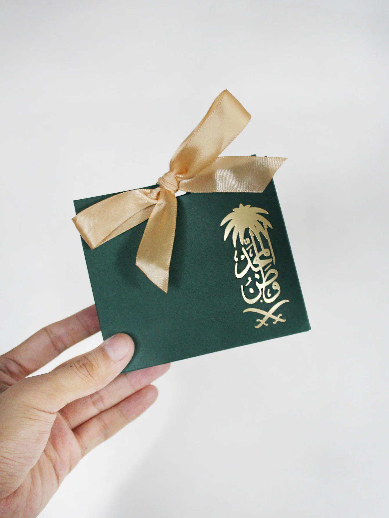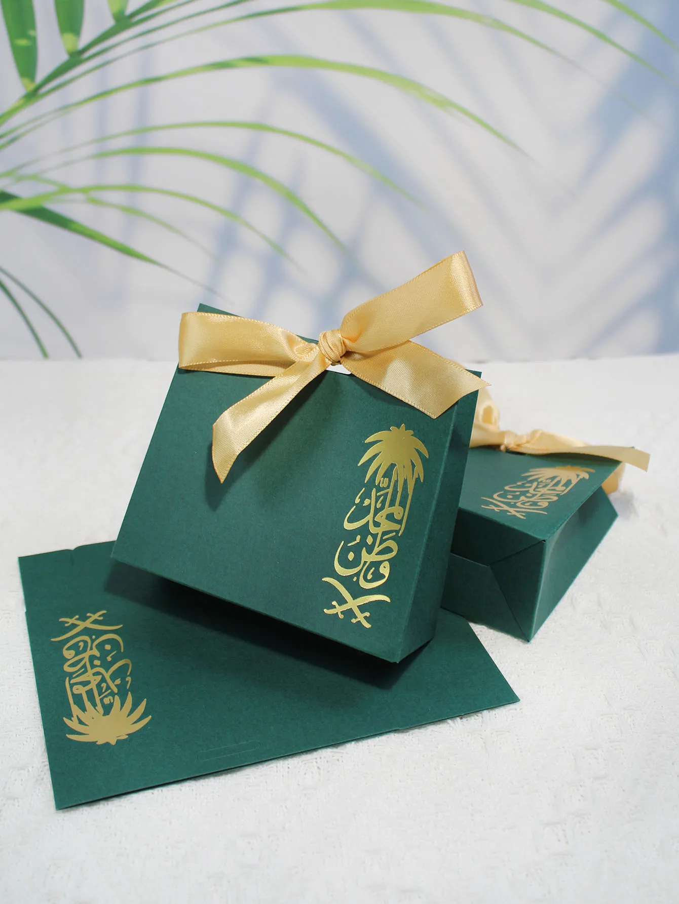 صندوق أخضر اليوم الوطني السعودي بشريط ذهبي ، مثالي للحلوى والشوكولاتة والبسكويت ، مثالي للحفلات ، رائع