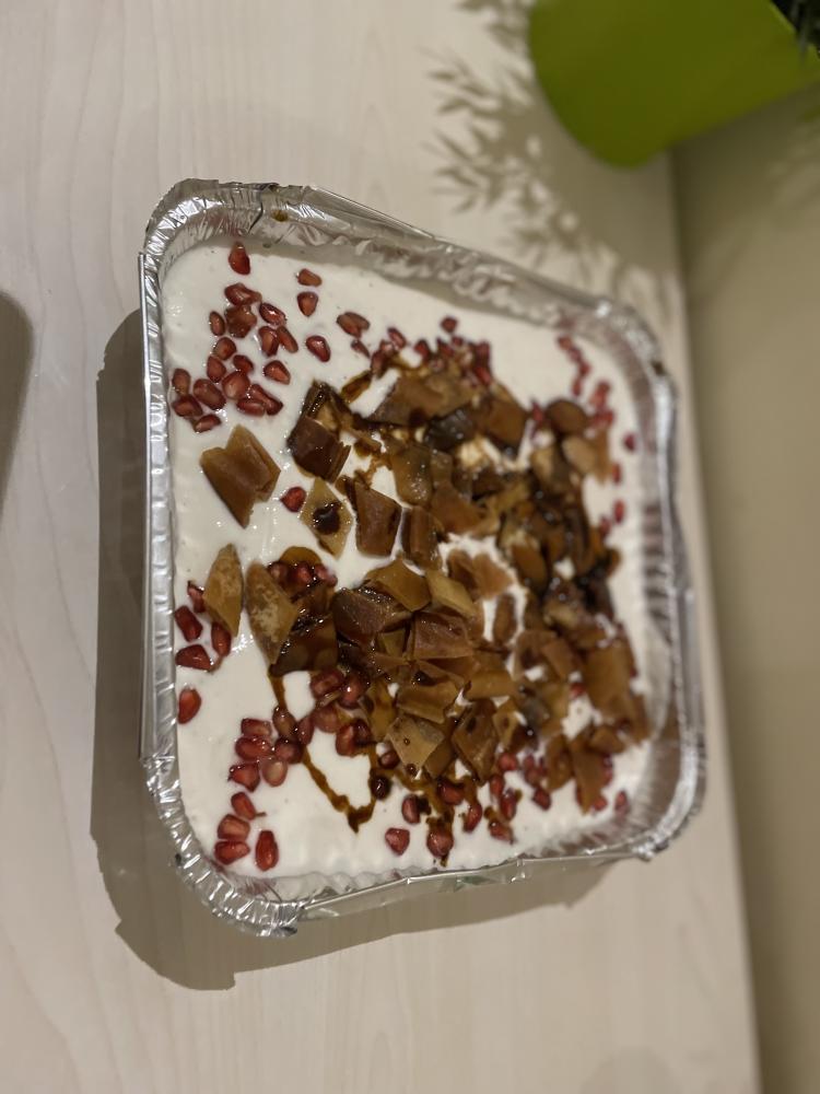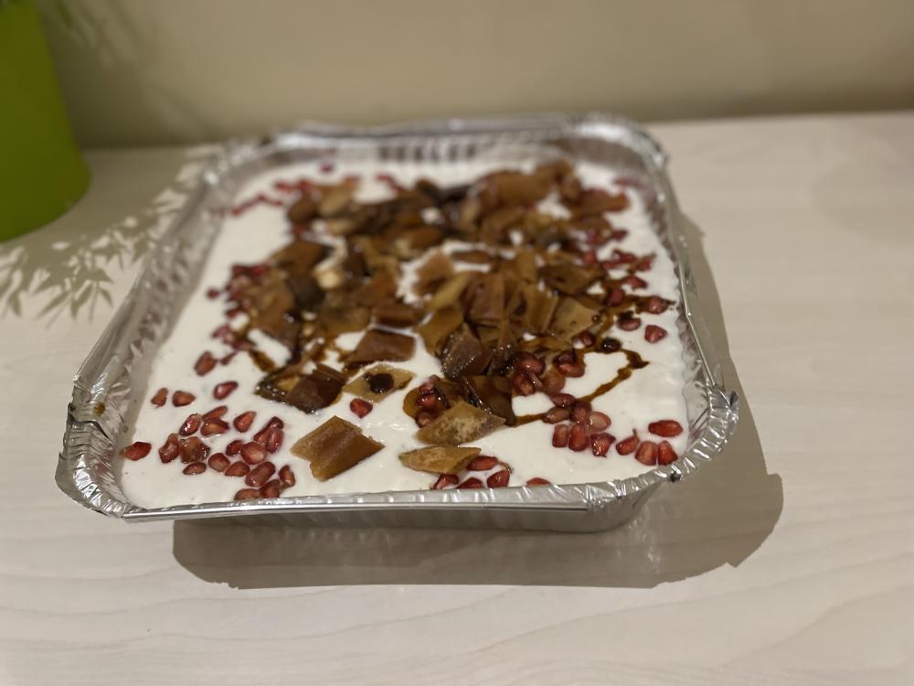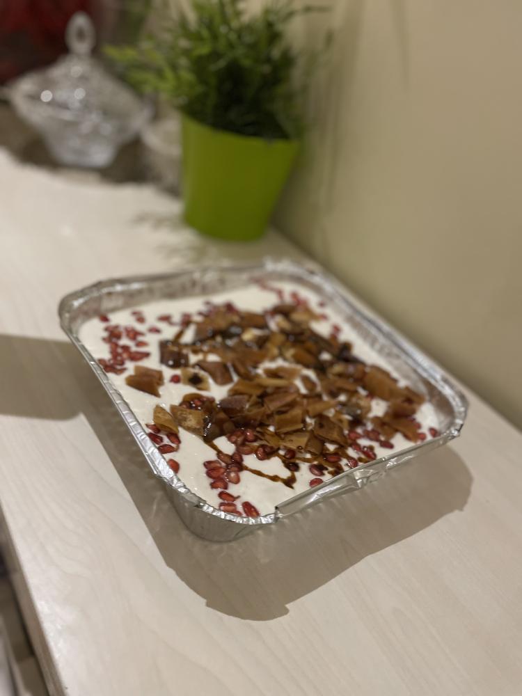 عبارة عن ورق عنب مطبوخ مع البهارات والأرز نفس طريقة ورق العنب الأصلية ويغطى بطبقة من صوص اللبن الحوض ويزين بمكعبات العيش المقلي .