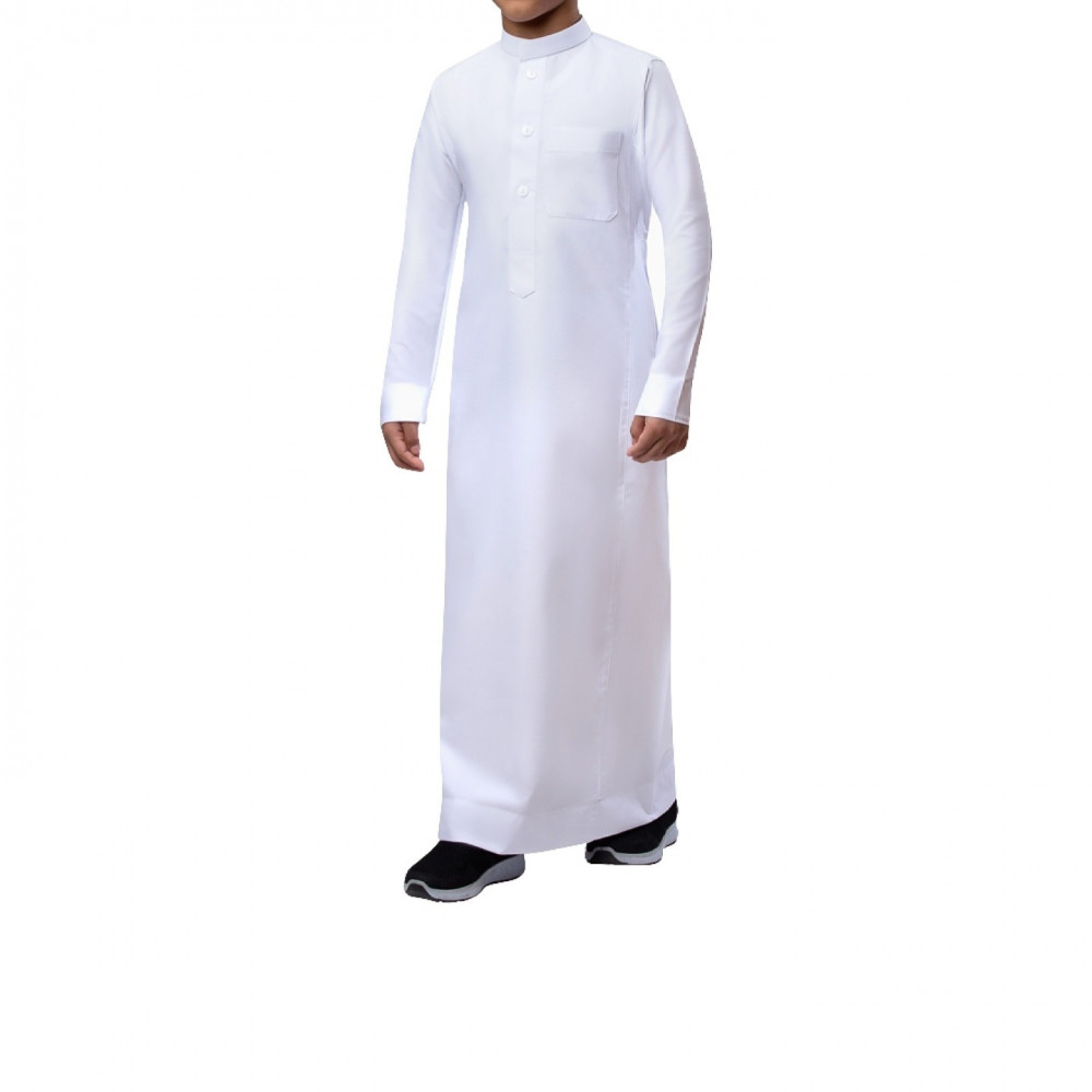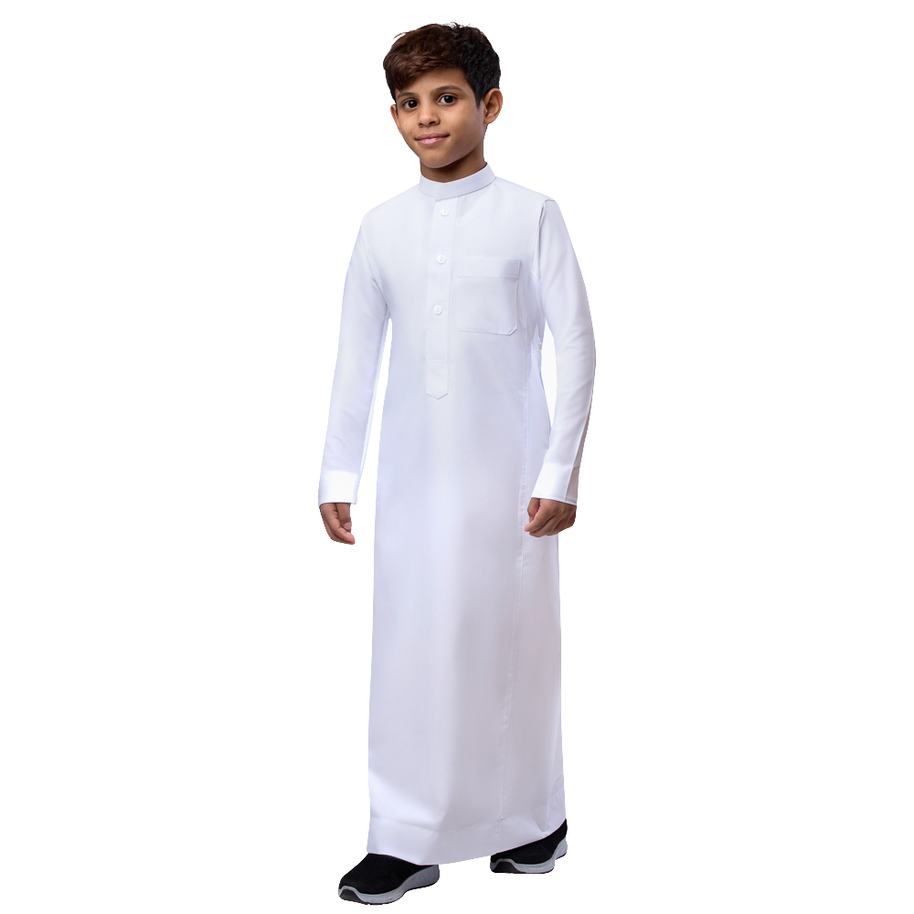ثوب سعودي بأدق التفاصيل وأجود أنواع أقمشة الثياب، يأتي بمقاسات مدروسة بعناية ليمنح طفلك الثقة في الملبس والمظهر. الثوب يأتي بياقة منحنية مريحة وأزرار بلاستيكية بيضاء خفيفة صممت لتعطي راحة أكبر عند اللبس، بالإضافة إلى جيب واحد علوي واثنين على الجوانب. الثوب من قماش بوليستر وملمس قطني وأكمام سادة مفصل بجودة ودقة عالية نتجت عن خبرات طويلة تجاوزت الثلاثين عاماً في صناعة الثياب