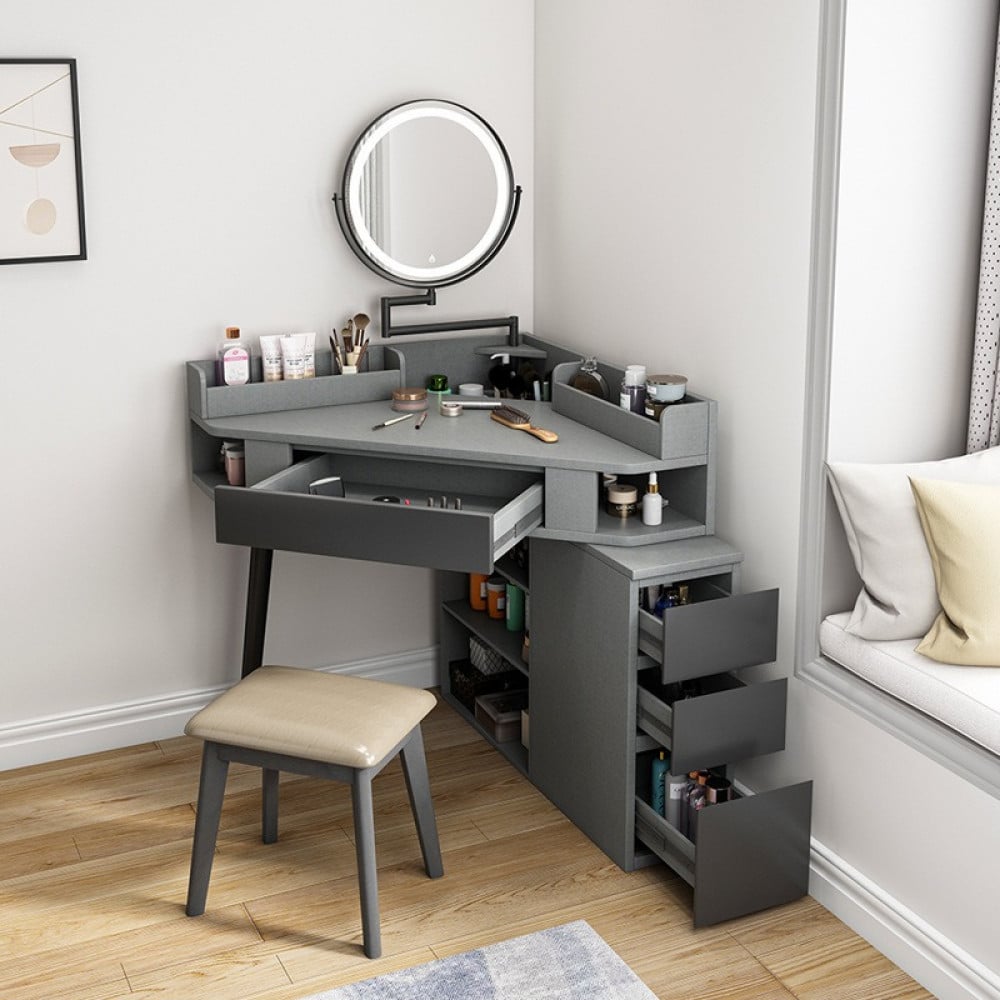 تسريحة زاوية بنمط حديث ، بخطوطها الأنيقة وبنيتها الخشبية المصمتة ، إنها قطعة خالدة تدوم لسنوات ، يتميز بخزانه بثلاثة أدراج للتخزين مع ارفف ومرأة متحركة وسطح مسطح لعرض العناصر ، متوفرة باللون الرمادي ، تأتي بمقاس (العمق 75 سم - العرض 75 سم - ارتفاع 84 سم) ، ستبدو رائعًا في أي منزل ، استخدمها كقطعة مميزة لديكور غرفة نومك.