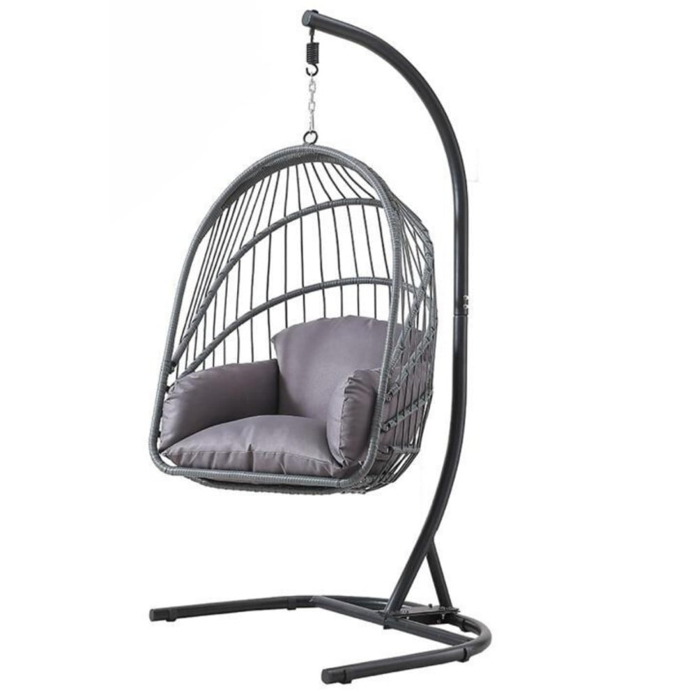كرسي أرجوحة معلق من الخوص. يتكون الكرسي من هيكل خارجي مصنوع من المعدن و يكون الكرسى ذاته مصنوع من الخوص الرمادى وسادة داخلية مصنوعة من القماش الرمادي. يتدلى الكرسي من عمود معدنى أسود مثبت على الأرض . و قابل للطى . الكرسي مصمم لتوفير الراحة والاسترخاء. يمكن استخدامه في الأماكن الداخلية أو الخارجية. يتميز الكرسي بتصميمه البيضاوي الأنيق، والذي يوفر مساحة كافية للجلوس بشكل مريح. كما أن وسادة الكرسي ناعمة ومريحة، مما يساعد على الاسترخاء.