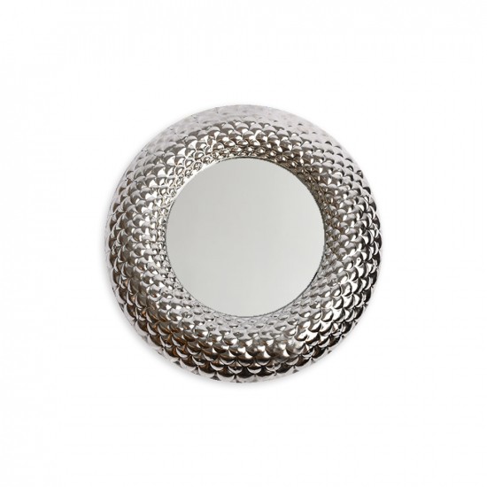 مرآة مستديرة ذات إطار معدني. المرآة مصنوعة من المعدن الفضى . الإطار المعدني له نمط هندسي جميل. المرآة هي عنصر شائع في الديكور الداخلي. يمكن استخدامها لإضافة لمسة من الأناقة والرقي إلى أي غرفة. يمكن أيضًا استخدام المرآة لعكس الضوء وجعل الغرفة تبدو أكبر .
