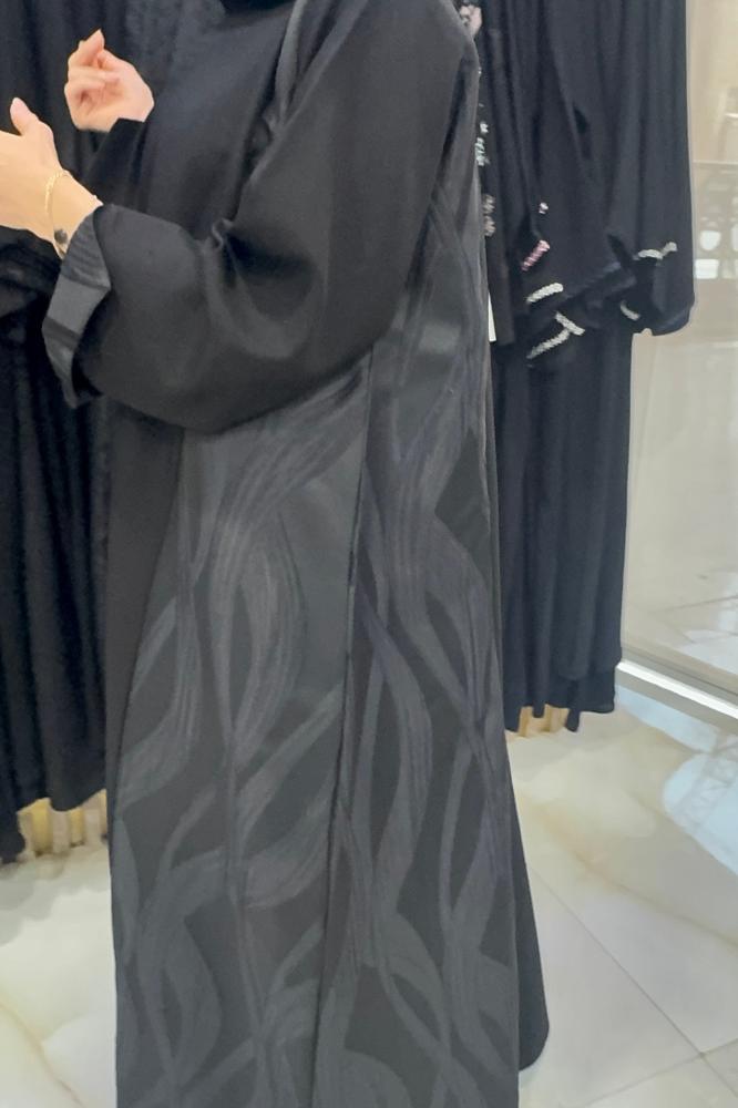 عباية بتدخيلات قماش جاكار هندي على الجوانب باضافة فتحة سبعة على الكم ليبرز جمال العباية