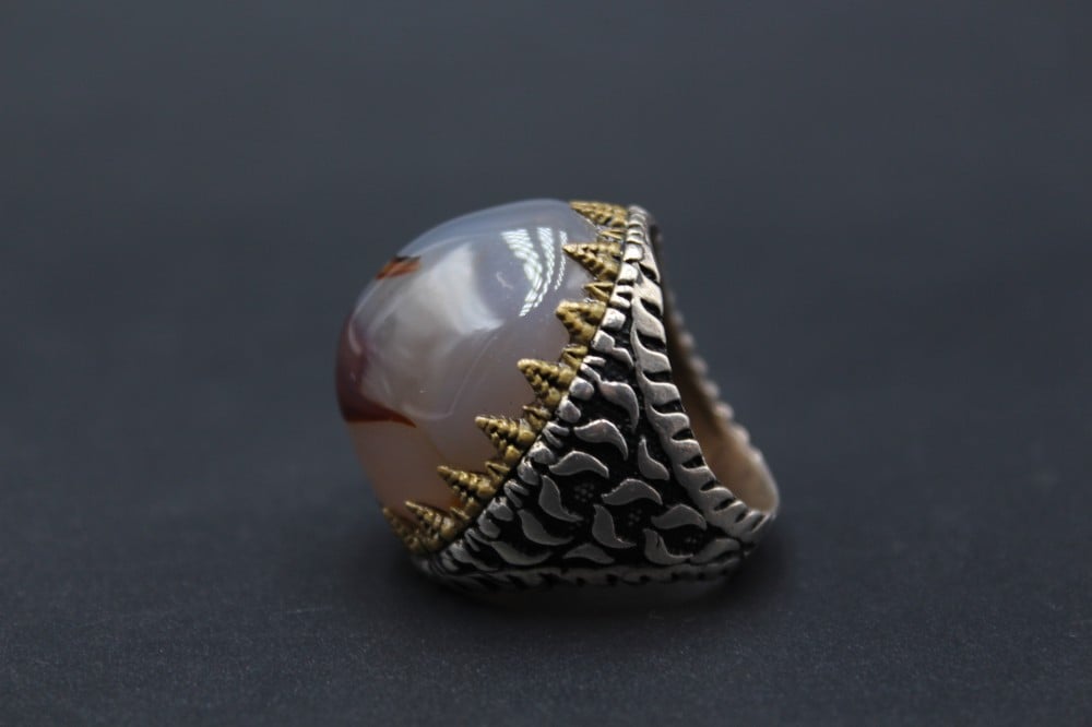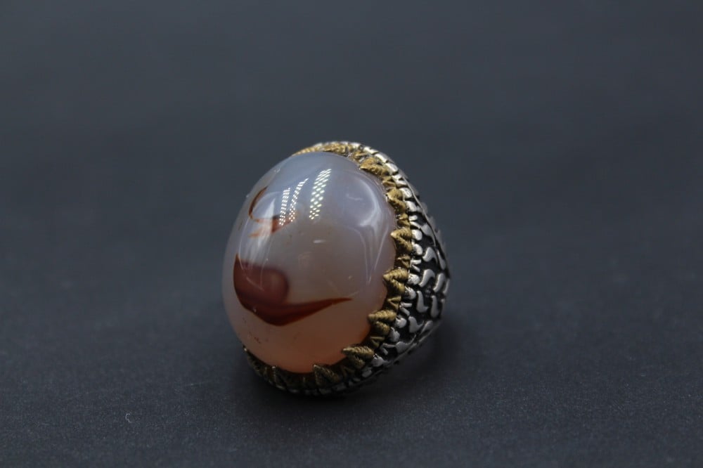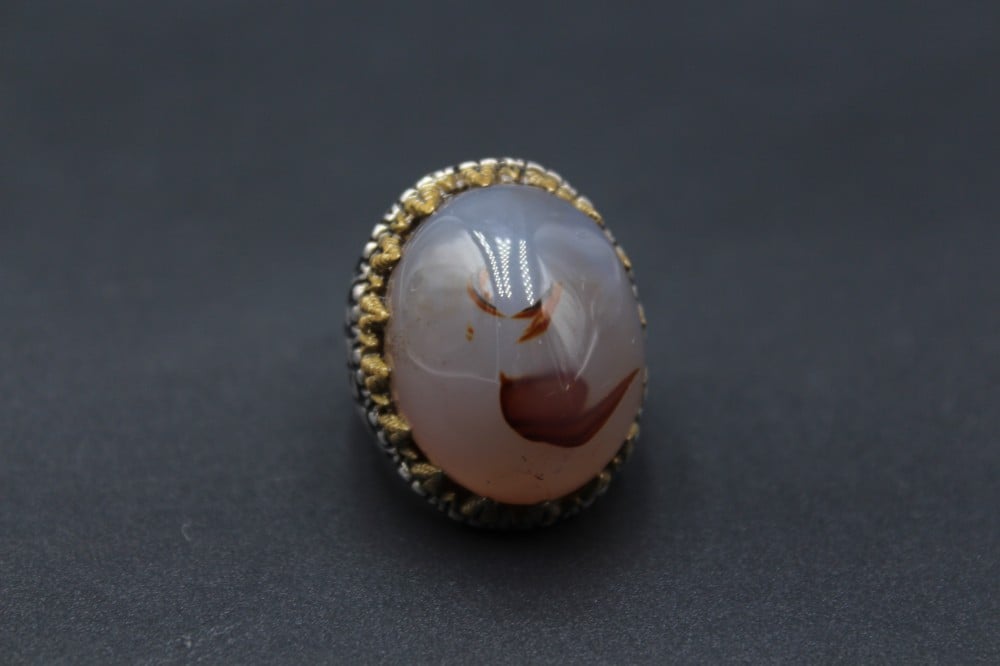 خاتم عقيق يماني مصور بصياغة يمنية فضة عيار 95مقاس الحجر/ 2.5×2.05 سمارتفاع/ 1.5 سموزن الخاتم/ 16 جرام