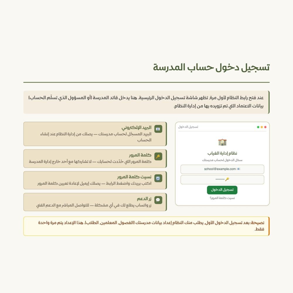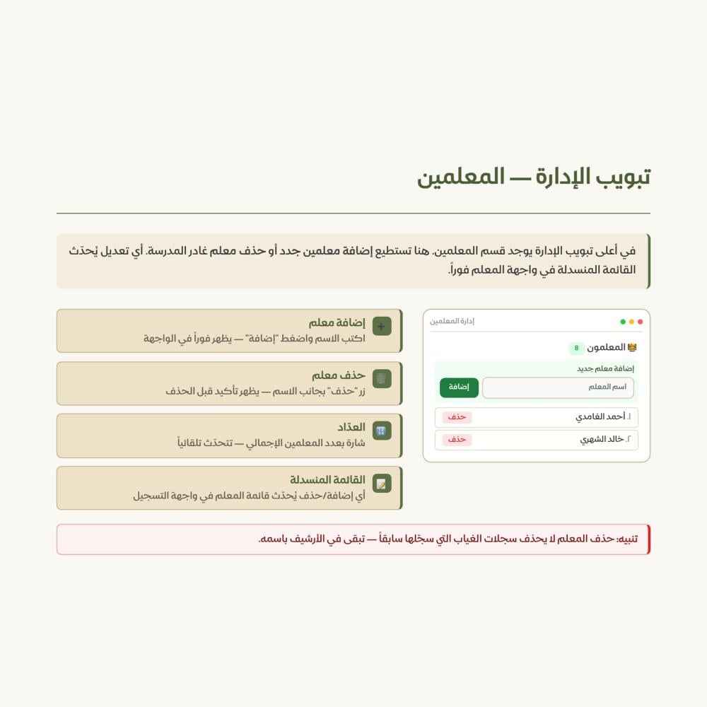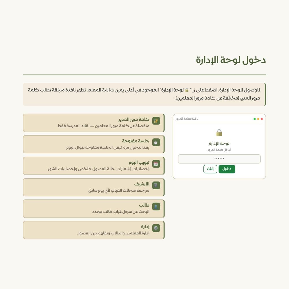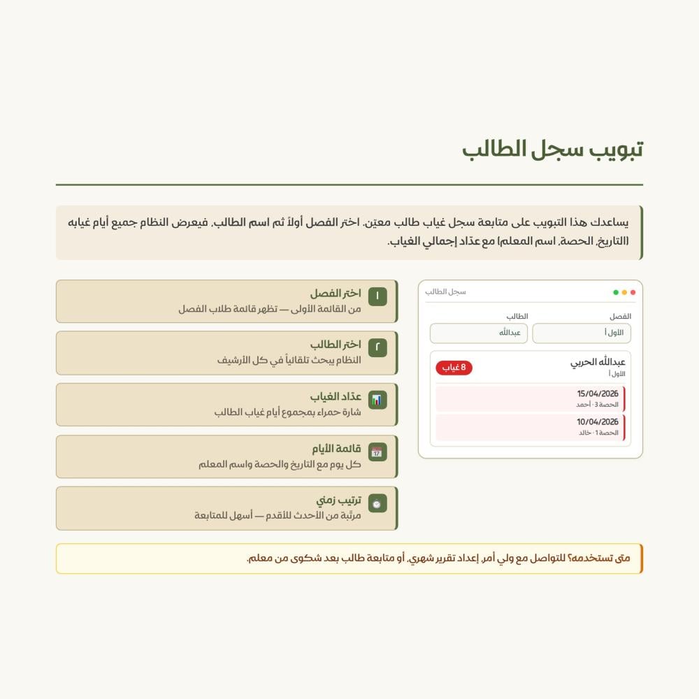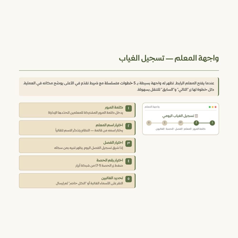 بدل ما يضيع وقت المعلمين يوميًا في تسجيل الغياب يدويًا، يوفّر لك النظام طريقة سريعة ومنظمة تختصر الجهد وترفع كفاءة العمل داخل المدرسة.