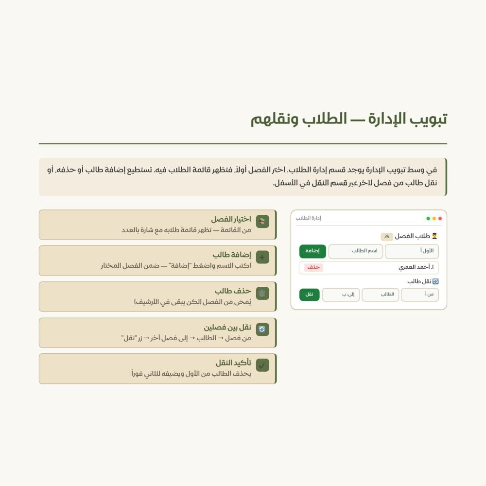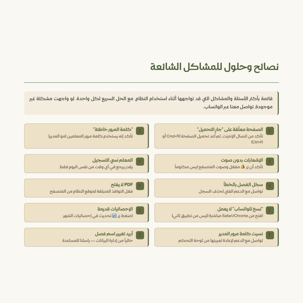 نظامنا يختصر هذه العملية بالكامل ويوفّر وقت المعلمين والإدارة، مما ينعكس مباشرة على جودة العمل داخل المدرسة.