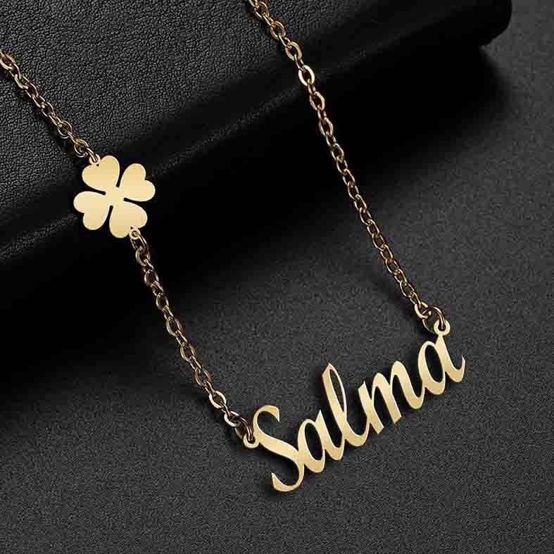 سلسال بقلادة اسم بالإنجليزي مع زهرة البرسيم مصنوعة من أجود أنواع الفضة الإسترليني 100% عيار 925 مطلية بالذهب عيار 21 قيراط اسم سلمى