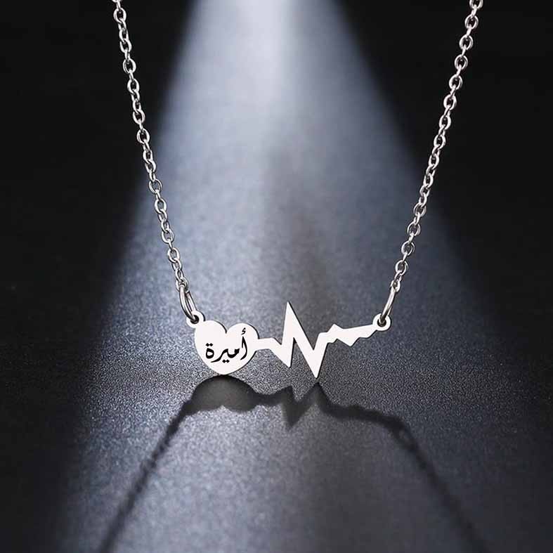عقود للنساء، مجوهرات نسائية، عقد فضي نسائي سلسال مع قلادة شكل موجة نبض قلب محفور عليها الاسم مصنوعة من أجود أنواع الفضة الاسترلينية 100% عيار 925 طول السلسال كامل 45 سم حجم الاسم 3.8 سم مجوهرات أصلية مناسبة جداً للاستخدام الشخصي أو لتقديمها كهدية في الأعياد والحفلات وجميع المناسبات. تأتي القلادة بصندوق محفور عليه اسمك وتغليف فاخر . جميع الأسماء متوفرة وفي حال عدم وجود اسمك يمكنك إجراء طلب شراء لأي اسم وكتابة الاسم المطلوب في خانة الملاحظات.