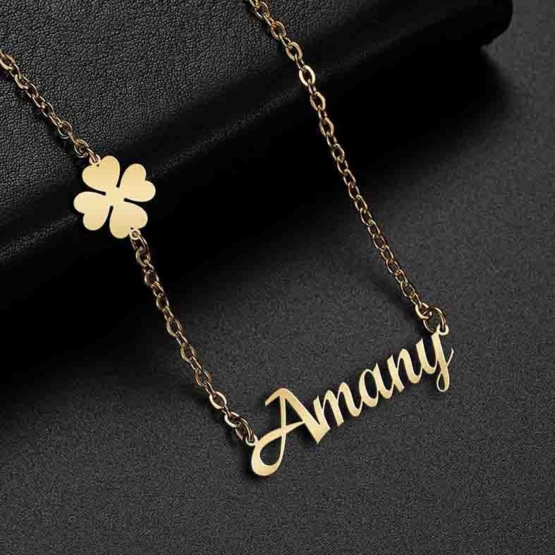 مجوهرات نسائية عقد نسائي سلسال مع قلادة بالإسم مع زهرة البرسيم مصنوع من أجود أنواع الفضة الاسترلينية 100% عيار 925 مطلية بالذهب عيار 21 قيراط طول السلسال كامل 45 سم حجم الاسم 3.3 سم مجوهرات أصلية مناسبة جداً للاستخدام الشخصي أو لتقديمها كهدية في عيد الزواج وعيد الحب وحفلات التخرج وجميع المناسبات. تأتي القلادة بصندوق محفور عليه اسمك وتغليف فاخر . جميع الأسماء متوفرة وفي حال عدم وجود اسمك يمكنك إجراء طلب شراء لأي اسم وكتابة الاسم المطلوب في خانة الملاحظات.