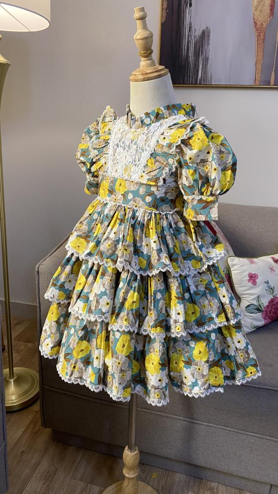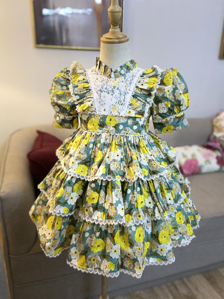 تميّزي بإطلالة طفلتك مع هذا الفستان الكلاسيكي الرائع المصمم بطبعات ورود نابضة بالحياة بدرجات الأصفر والأبيض مع لمسة من الأخضر الزمردي. يتميز بقصة منفوشة متعددة الطبقات مزينة بدانتيل أبيض ناعم يضفي لمسة أنثوية راقية. الياقة المرتفعة والتفاصيل المطرزة على الصدر تمنح الفستان أناقة فريدة مثالية للمناسبات الخاصة أو جلسات التصوير.