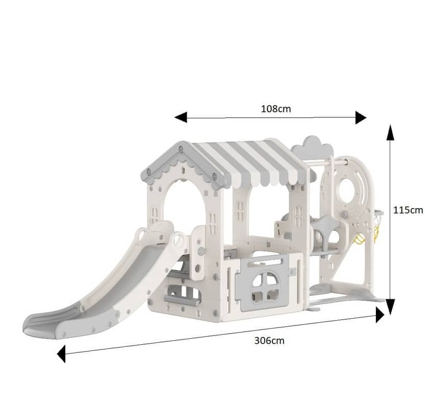ملعب أطفال 6 في 1: 1. زحليقة بمنصة منقوش عليها نقوش.; 2. مساحة داخلية واسعة: اقرأ كتابًا مصورًا أو العب بالألعاب.; 3. تتضمن سلة مرمى، 4. تأتي مع أرجوحة، لتتمكن من اللعب بحرية كما يحلو لك.; سهلة التخزين والتركيب، لتتمكن من اللعب في الداخل حتى في الأيام الممطرة: يمكنك اللعب في الداخل حتى في الطقس السيئ.; سهلة التركيب، فلا داعي للقلق بشأن تحريك الزحليقة.; تصميم خفيف الوزن يُسهّل على النساء التركيب والنقل والتخزين(اهتمام دقيق بالسلامة) زوايا مستديرة لمزيد من الأمان.; 1. منصة منقوش عليها نقوش: تميل ببطء، مقبض سهل ، درجة عريضة تجعلها آمنة للصعود والنزول.; 2. مساحة هبوط واسعة: كبيرة على سطح الزحليقة، لذا فهي آمنة للأطفال الصغار.; 3. منحدر طويل.; الكثير من اللعب(مظهر جميل وألوان هادئة) تصميم لطيف يضفي لمسة مرحة على الطفل.; ستتناسب الألوان الهادئة مع ديكور معظم الغرف، لذا لن تشعر بعدم الراحة عند وضعها في الغرفة