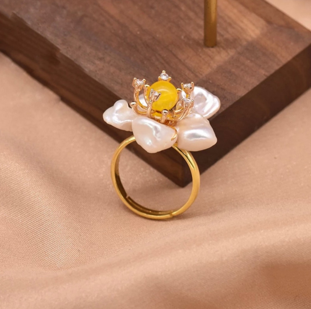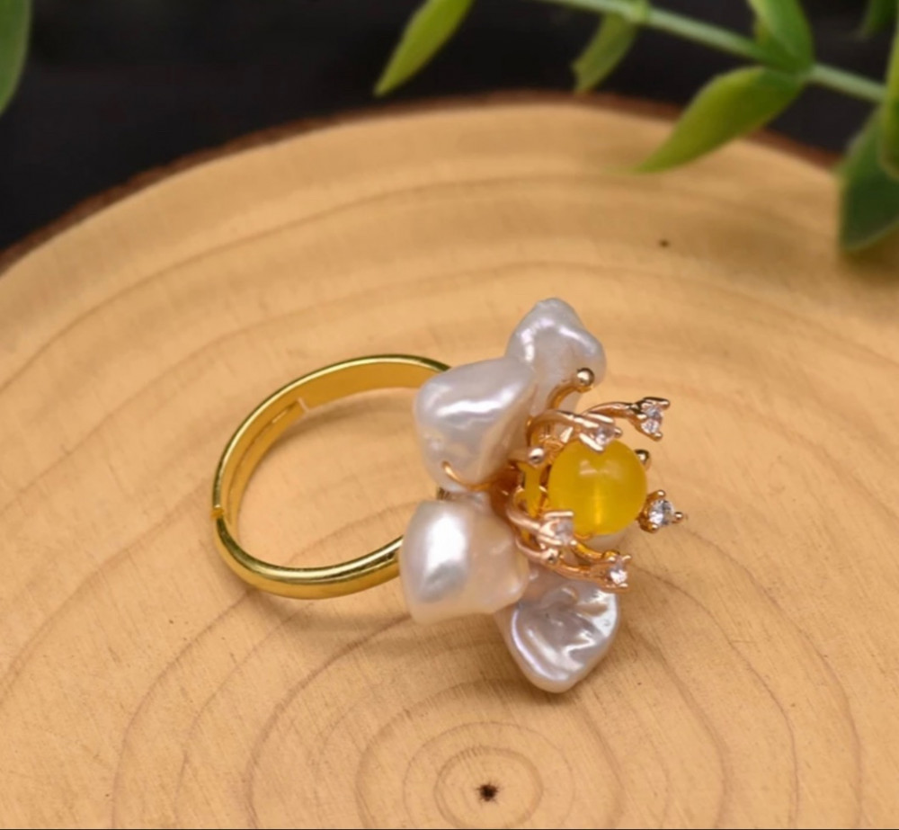- يتميز بتصميمه الذي لا مثيل له بفص اصفر اللون تحيط به حبات اللؤلؤ.