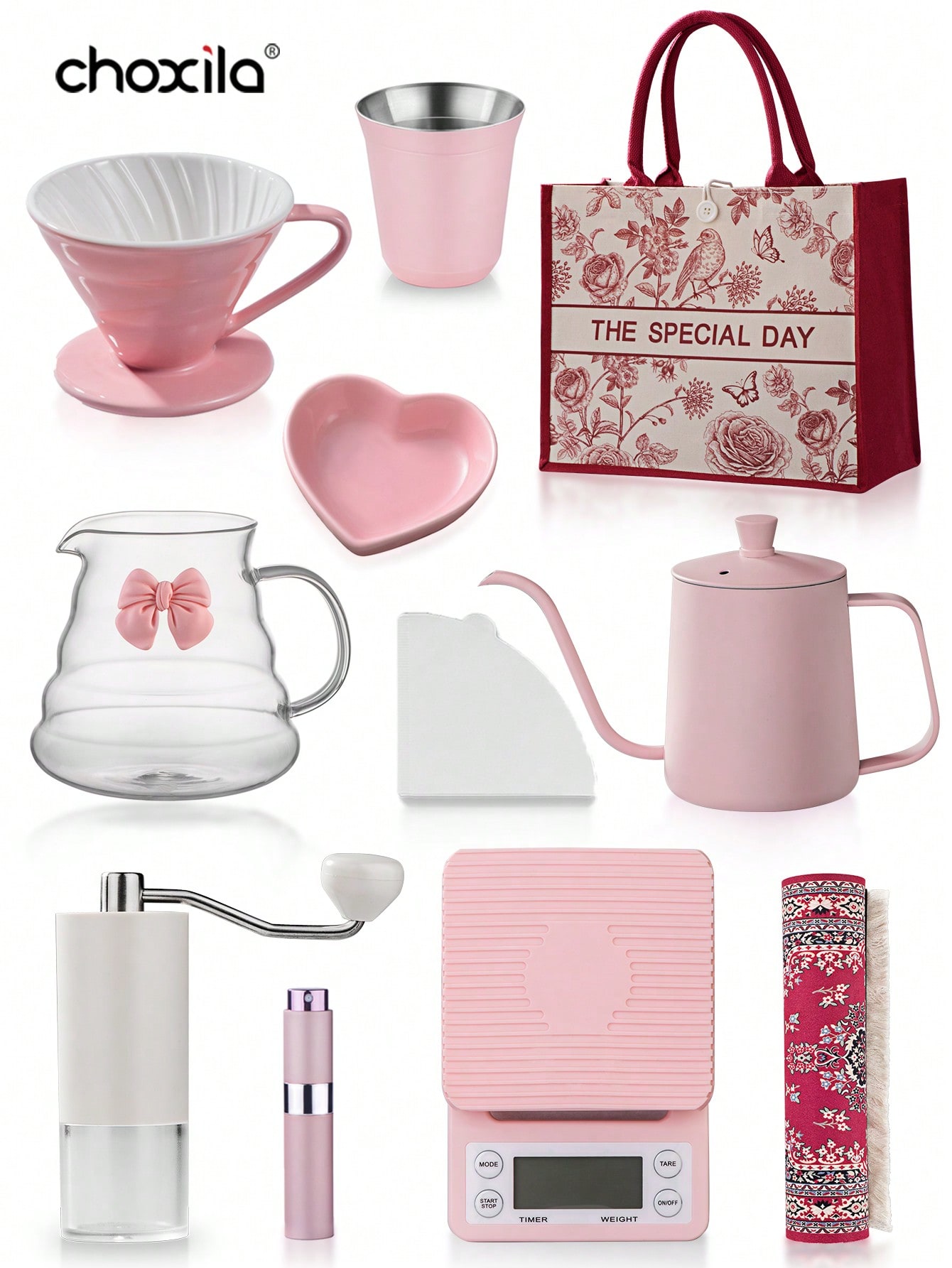 choxila طقم القهوة V60، طقم صانع القهوة المُنساب بحجمي 01 و02 بلون وردي، هديّة رائعة لعيد الحب، هديّة احتفالية للمنَاسبات والأعياد، إكسسوارات قهوة محمولة للسفر، هديّة إبداعية وردية للفتيات لعيد الأم /البنت/الحبيبة/الأسرة/الأصدقاء لبداية العام الدراسي