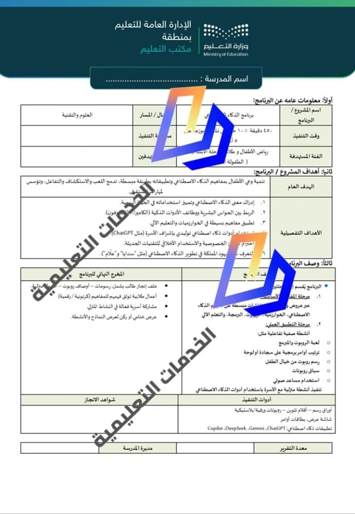 تقرير جاهز للاستخدام يوثّق تنفيذ برنامج "الذكاء الاصطناعي" ضمن الأنشطة الطلابية في مجال العلوم والتقنية، مخصص لرياض الأطفال والصفوف الأولية.