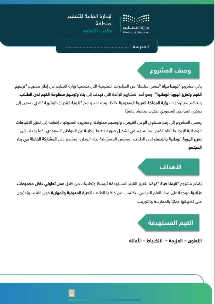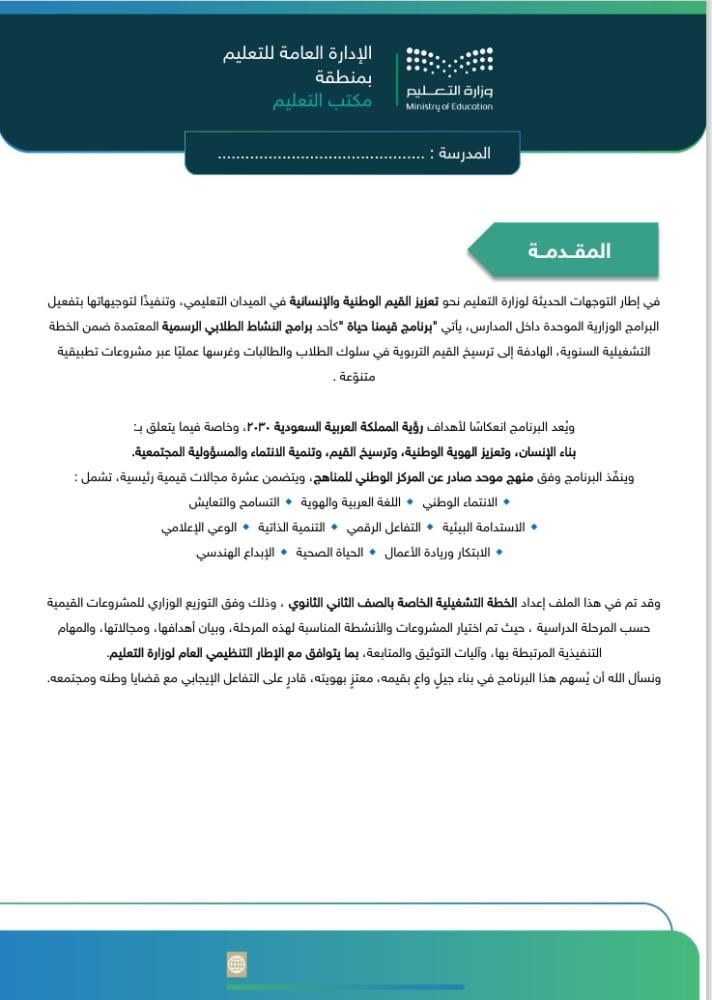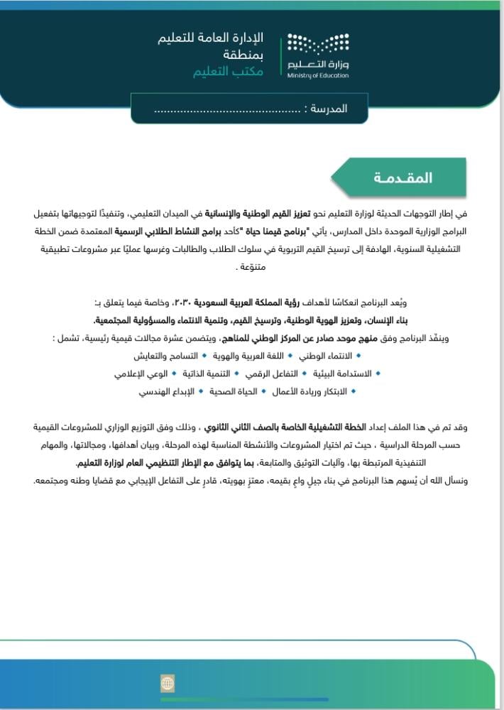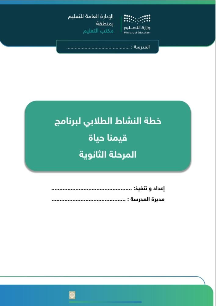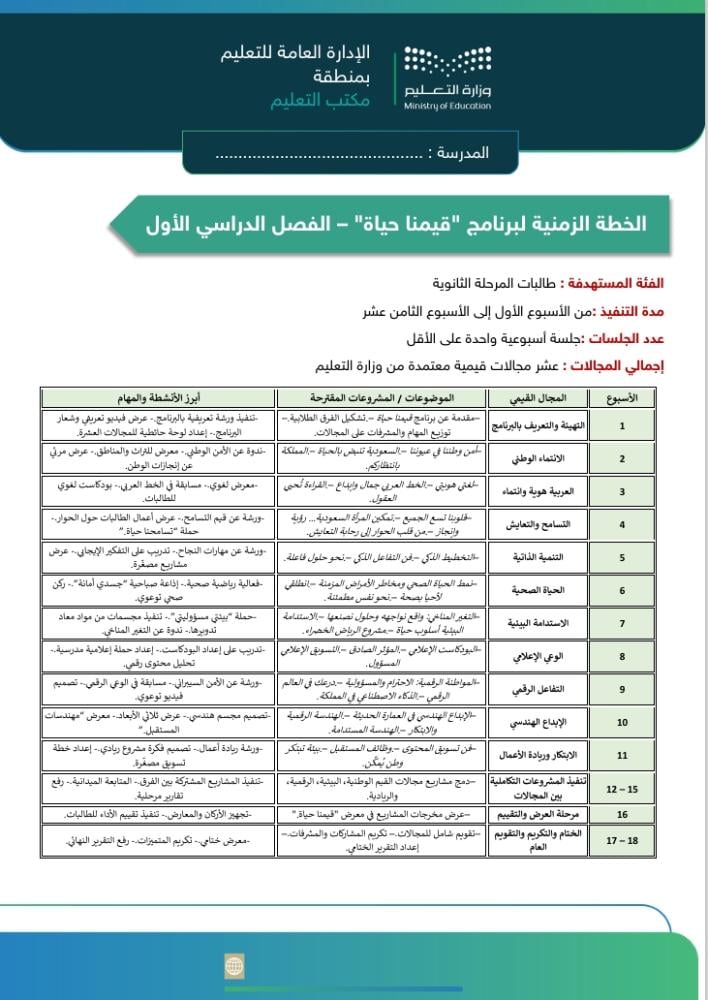 خطة تشغيلية متكاملة وجاهزة لبرنامج النشاط الطلابي "قيمنا حياة" للمرحلة الثانوية، وفق المجالات العشرة المعتمدة من وزارة التعليم.