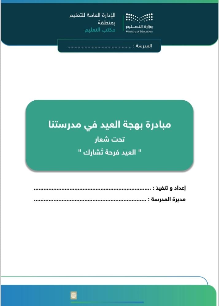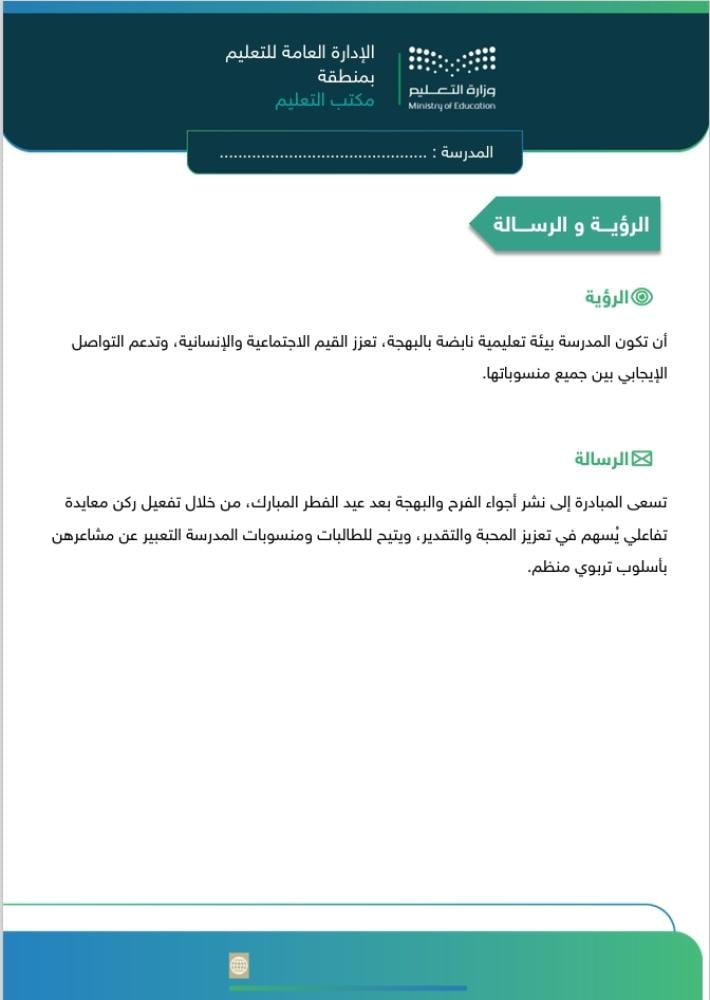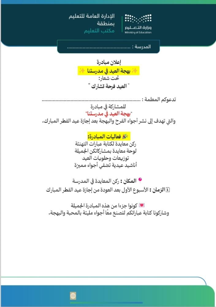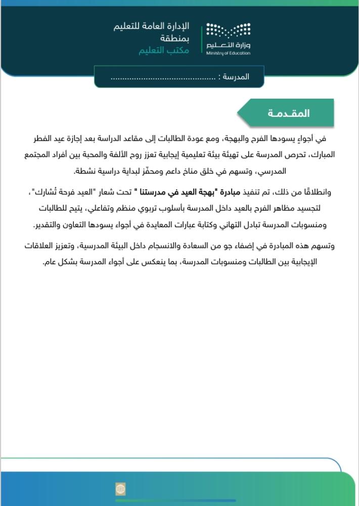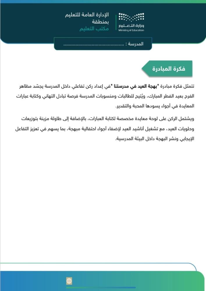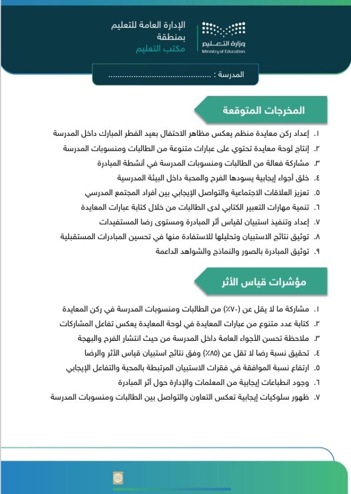 ملف مبادرة متكامل وجاهز للتطبيق والتوثيق داخل المدرسة، يساعدك على تنفيذ ركن معايدة احترافي ينشر الفرح ويعزز القيم الاجتماعية بين الطالبات ومنسوبات المدرسة بعد إجازة عيد الفطر المبارك.
