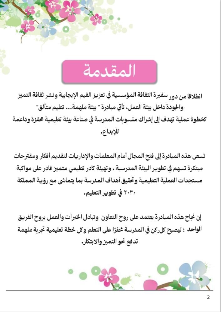 ملف مبادرة "بيئة ملهمة… تعليم متألق" هو نموذج جاهز ومتكامل يمكن تطبيقه داخل المدارس بهدف تطوير البيئة التعليمية وتأهيل الكادر التعليمي من خلال إشراك منسوبات المدرسة في تقديم أفكار ومقترحات إبداعية قابلة للتنفيذ.