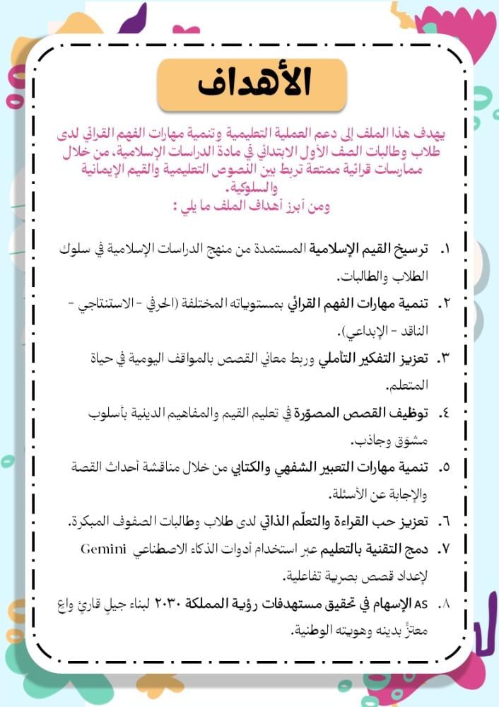 ملف تربوي تعليمي مُبتكر يهدف إلى تنمية مهارات الفهم القرائي لدى طلاب وطالبات الصف الأول من خلال قصص مصوّرة ممتعة أُعدت بتقنيات الذكاء الاصطناعي (Gemini AI)،