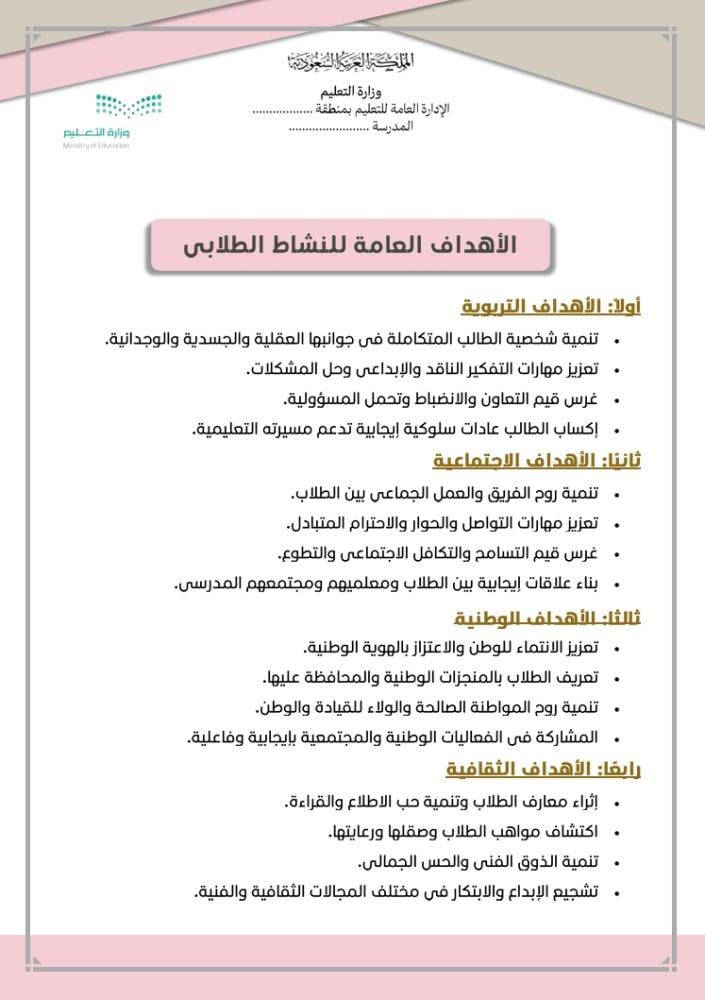 - الأهداف العامة للنشاط (تربوية – اجتماعية – وطنية – ثقافية).