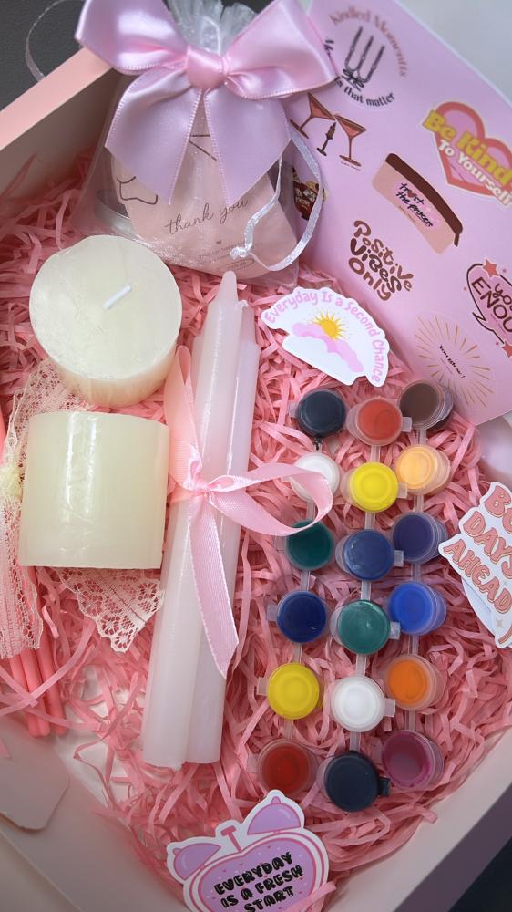 ٣ حبات من الشموع الطويلة وحبتين من الشموع الصغيرة بالاضافة الالوان والفرشاة والستيكرات 🕯️