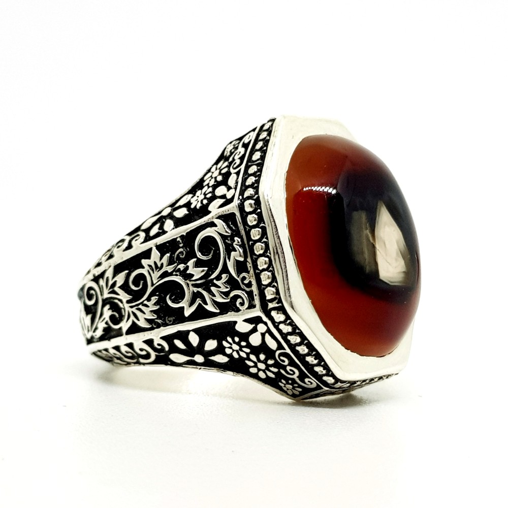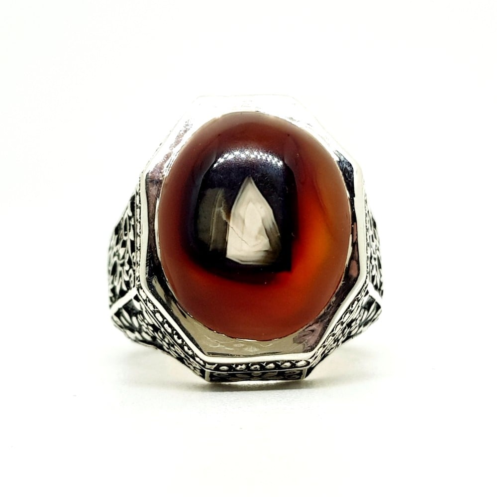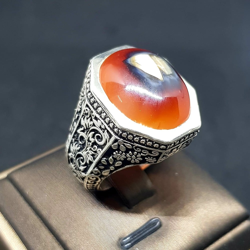 خاتم عقيق يماني كبدي (Agate) صياغة يدوية مميزة فضة عيار (990)