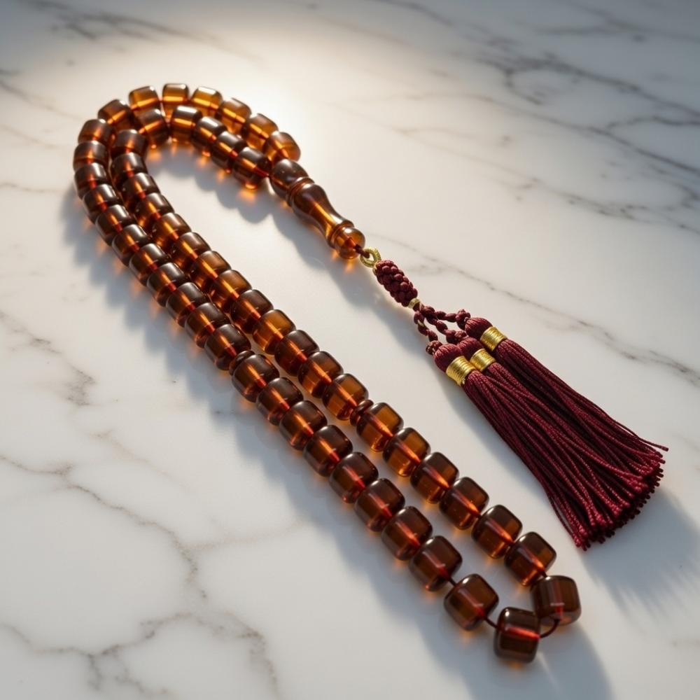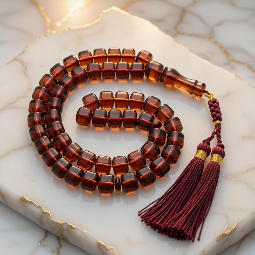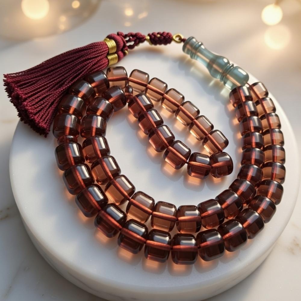 سبحة زعفران لون حرباء متغير من اللون الاخضر الى اللون العودي حسب الاضاءة مقاس 11×10 ملم 45 خرزة قص برميلي بكركوشة تفصال