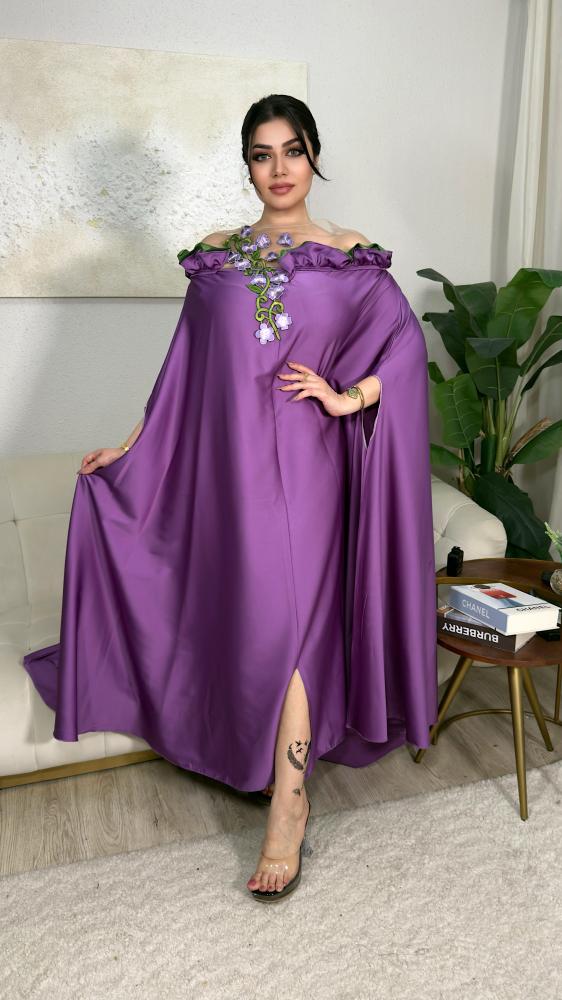 جلابية مصنوعه من قماش الحرير بلون الموف الداكن والقصه القطرية المميزه لتحصلي علئ إطلاله أنثوية ساحره مع قصة مميزة ع الاكتاف بللون الاخضر البارد مع تطريز الورد بحركه مائلة لتعطي منظر الانوثه الطاغية خيار مناسب لجميع الأذواق والمناسبات