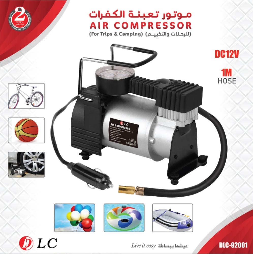 ماطور هواء DLC-92001، وهو مصمم خصيصًا لملء إطارات السيارات ومناسب للرحلات والتخييم.