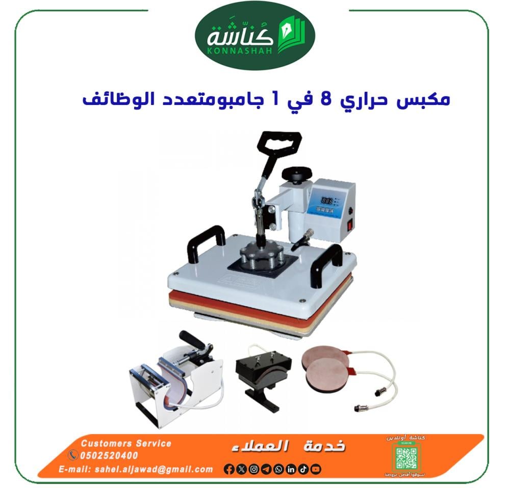 اكتشف مكبس حراري متعدد الوظائف 8×1 الذي يجمع بين التصميم الأنيق والأداء الفائق لتحويل أفكارك إلى واقع ملموس! يتميز هذا المكبس بتصميمه العصري الذي يجعله الخيار المثالي للمبدعين في مجالات الطباعة والتصميم.