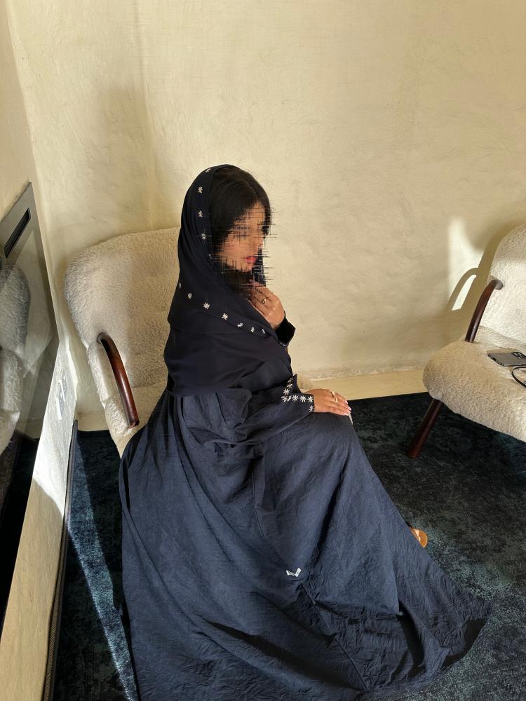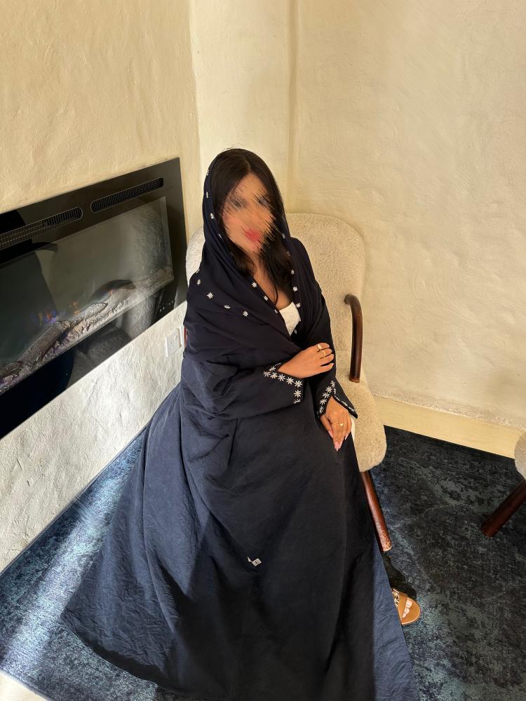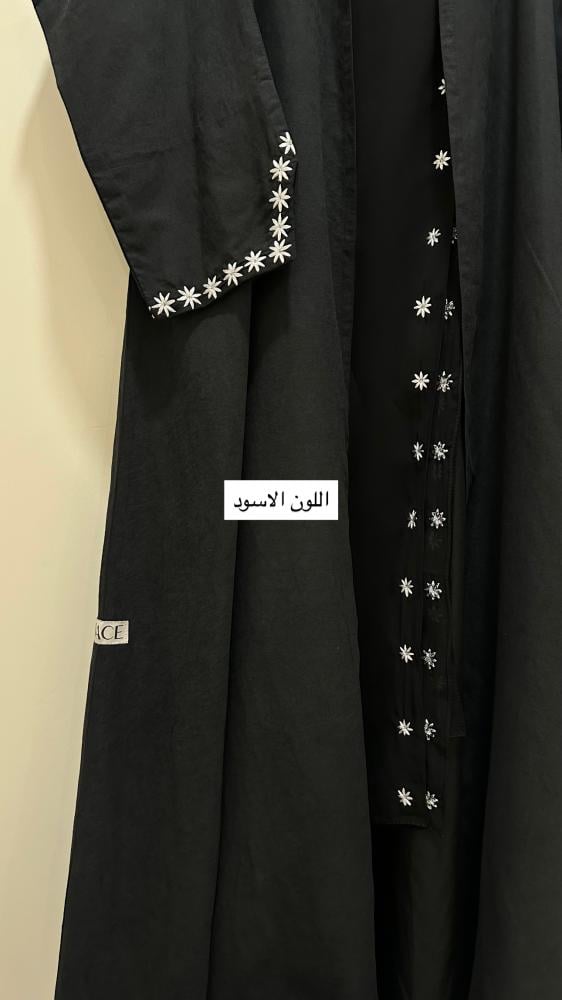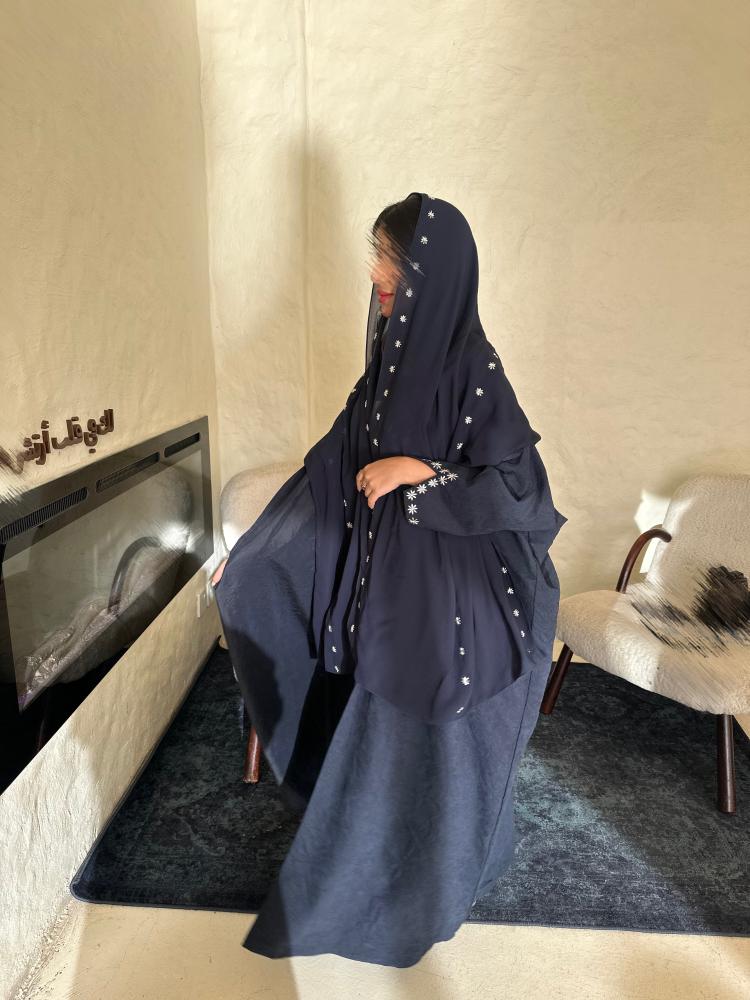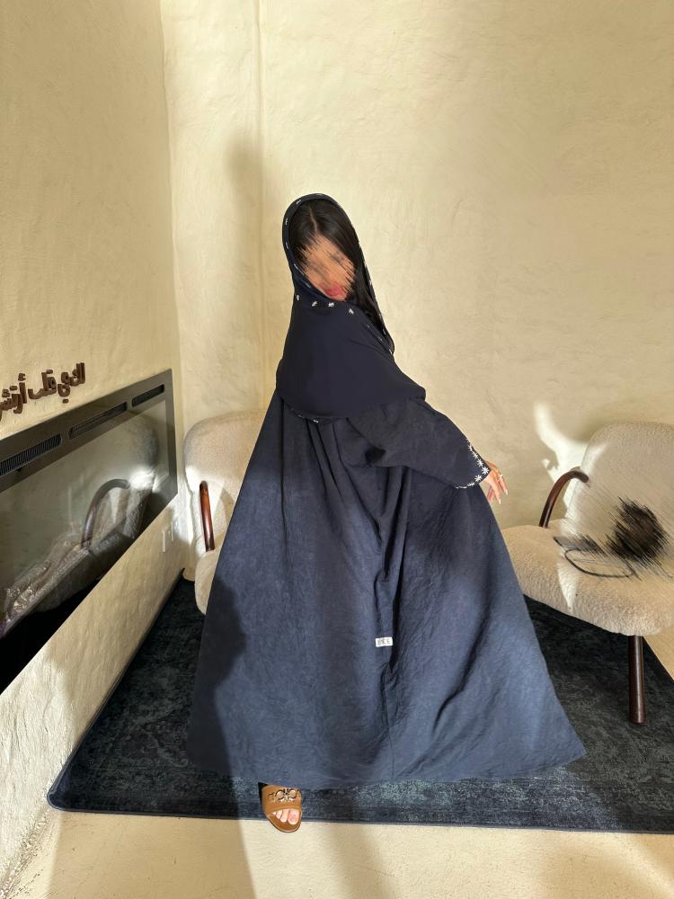 عباية قصة نص بشت (فراشه) قماش شامواه حرير مكسر باللون الكحلي مع تطريز فضي على الطرحه كامله والاكمام