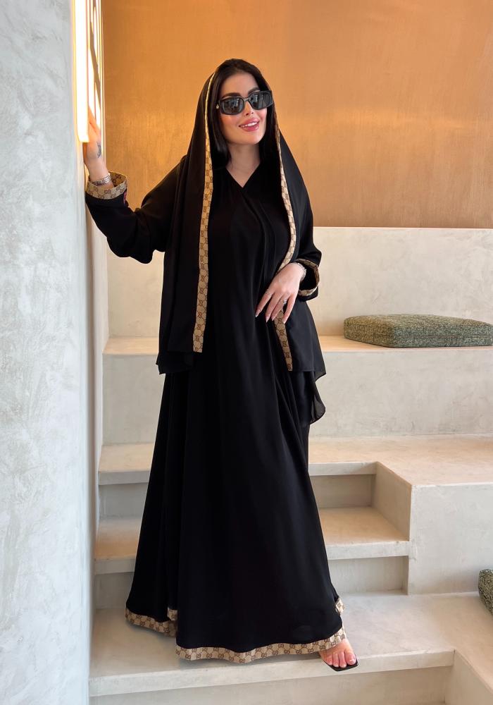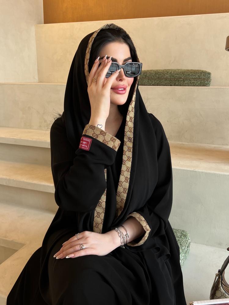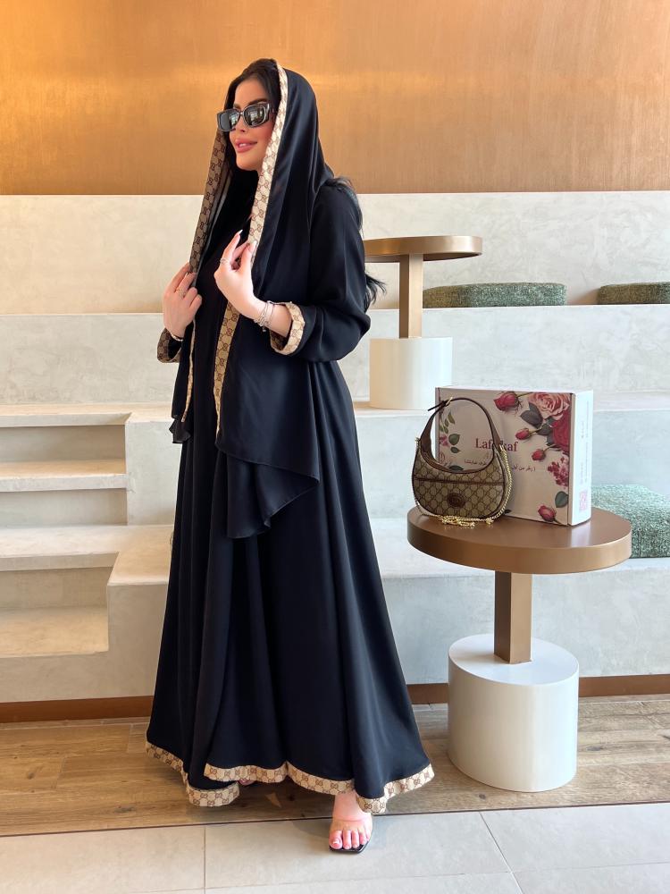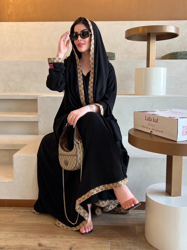 شياكة تخطف الأنظار مع عباية قوتشي من لفة كاف. مصنوعة من قماش ملكي فاخر باللون الأسود، ومزينة بلمسات نقشة قوتشي فاخرة على الأطراف والأكمام تعطيها حضور مختلف. تصميم يوازن بين العملية والفخامة ويجي مع طرحة من نفس القماش لإطلالة متكاملة.