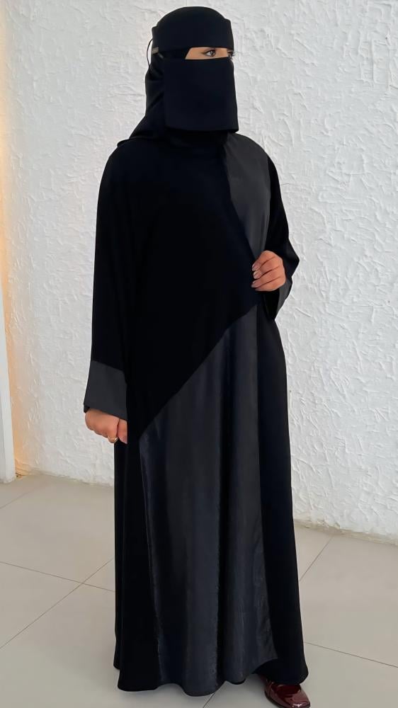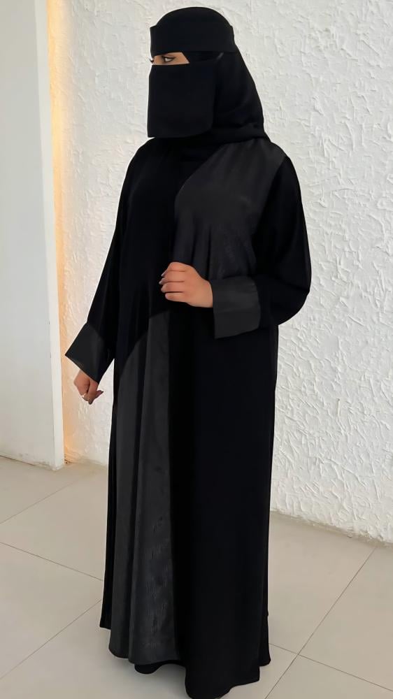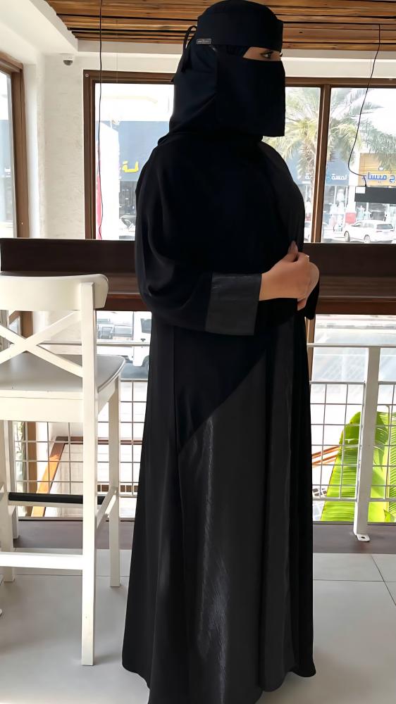 عبايه بقصة نص كلوش بقماش كريب ملكي كوري وقماش شيفون لامع من الامام والاكمام مقاس اسورة الكم 6 انش