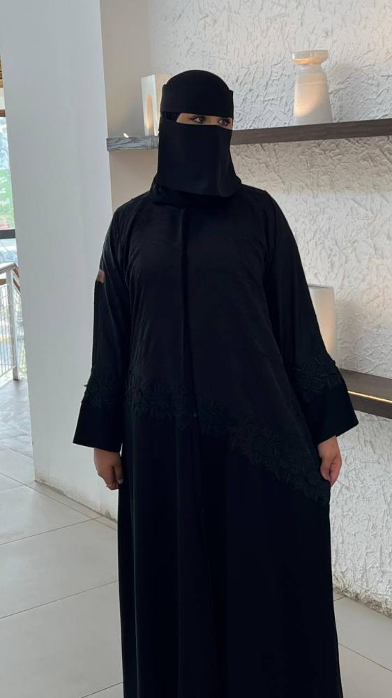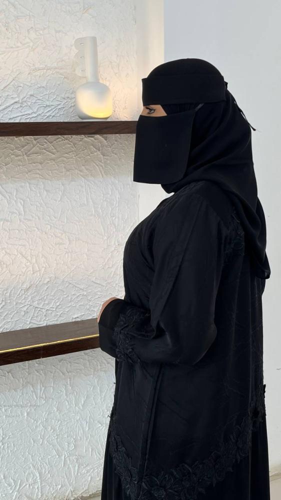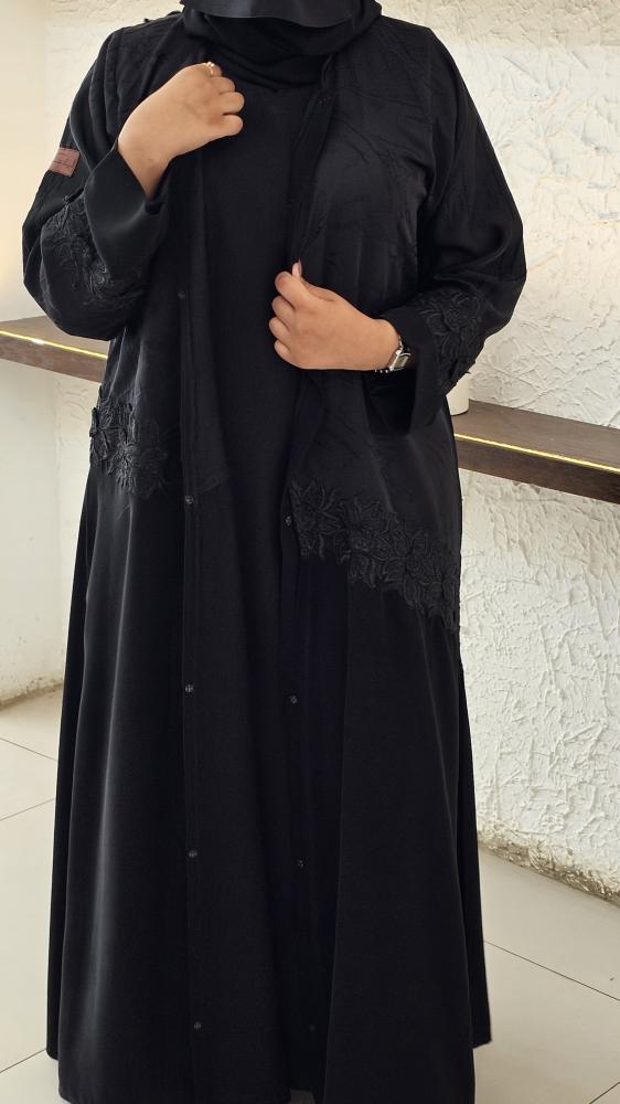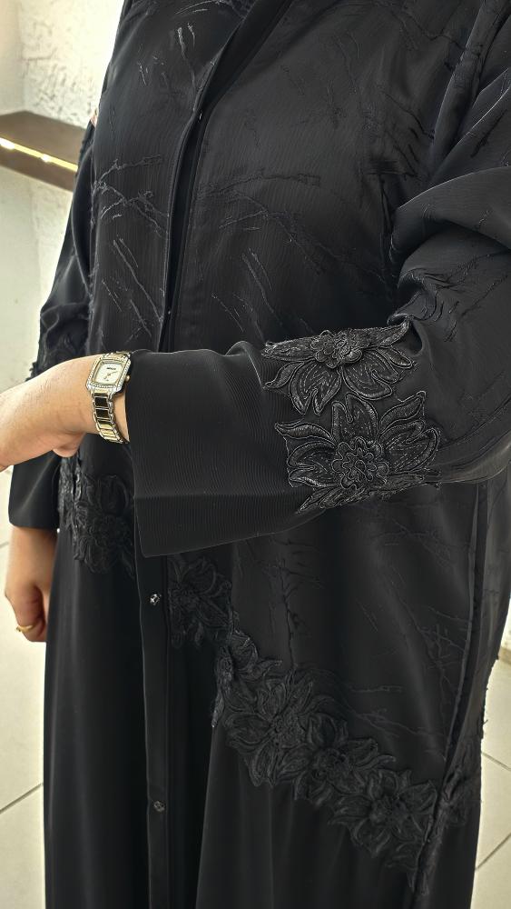 عبايه بقصة نص كلوش بقماش كريب ملكي كوري وقماش جاكار وكلفة ورد مقاس اسورة الكم 6 ونص انش
