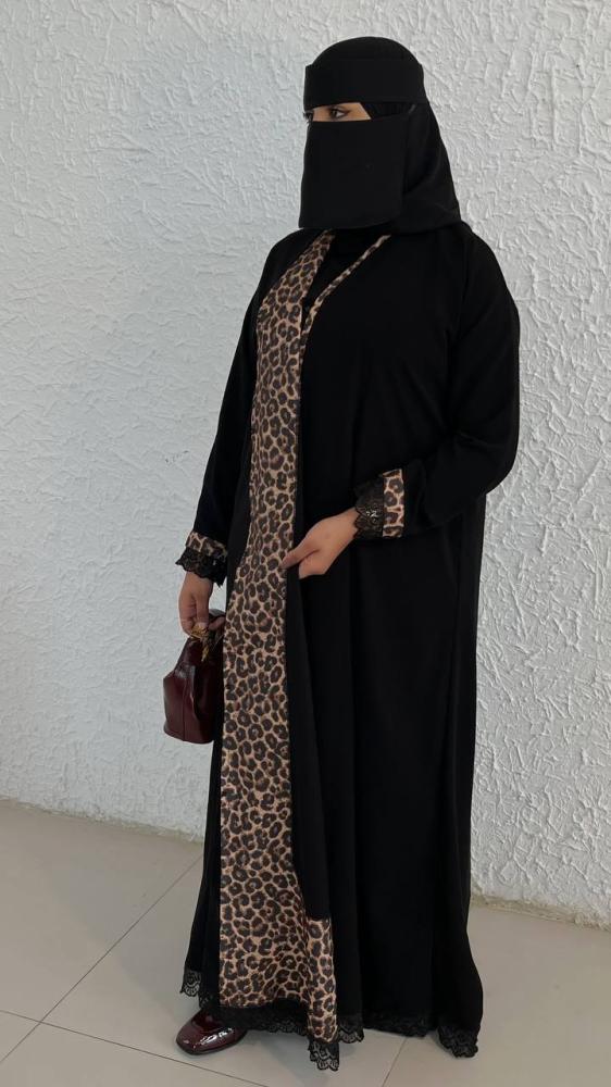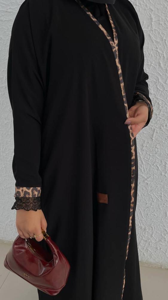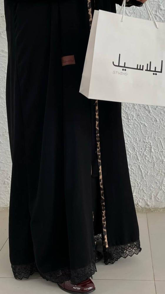 عبايه بقصة نص كلوش بقماش كريب ملكي كوري بطقطق من الامام وبتطعيم بقماش التايقر من حواف الامام والاكمام وبتزيين بكلفة دانتيل ف الاكمام والذيل من الاسفل وكما تم تبطين حواف العبايه من الداخل بالتايقر وبمقاس اسورة الكم 5 ونص
