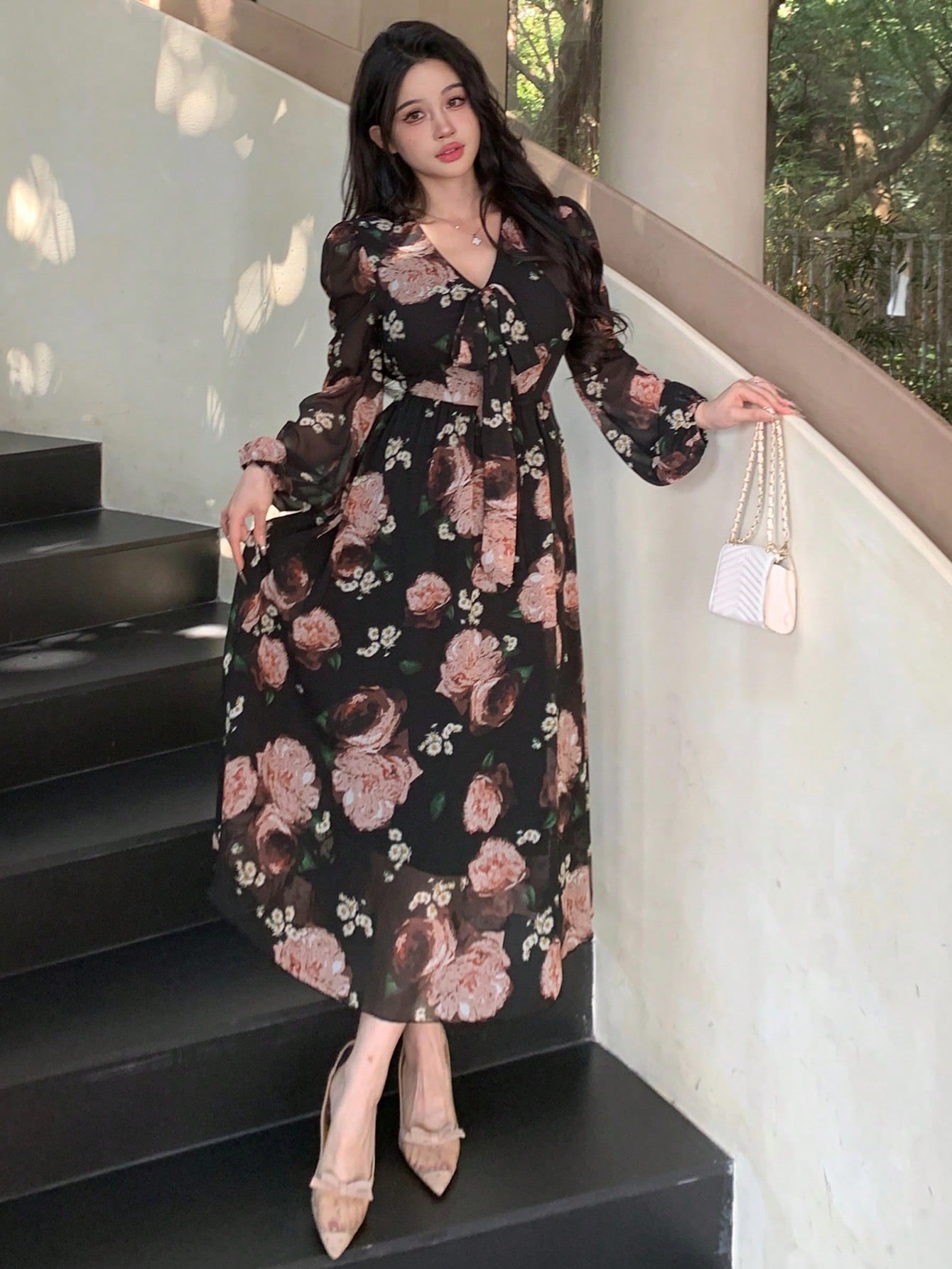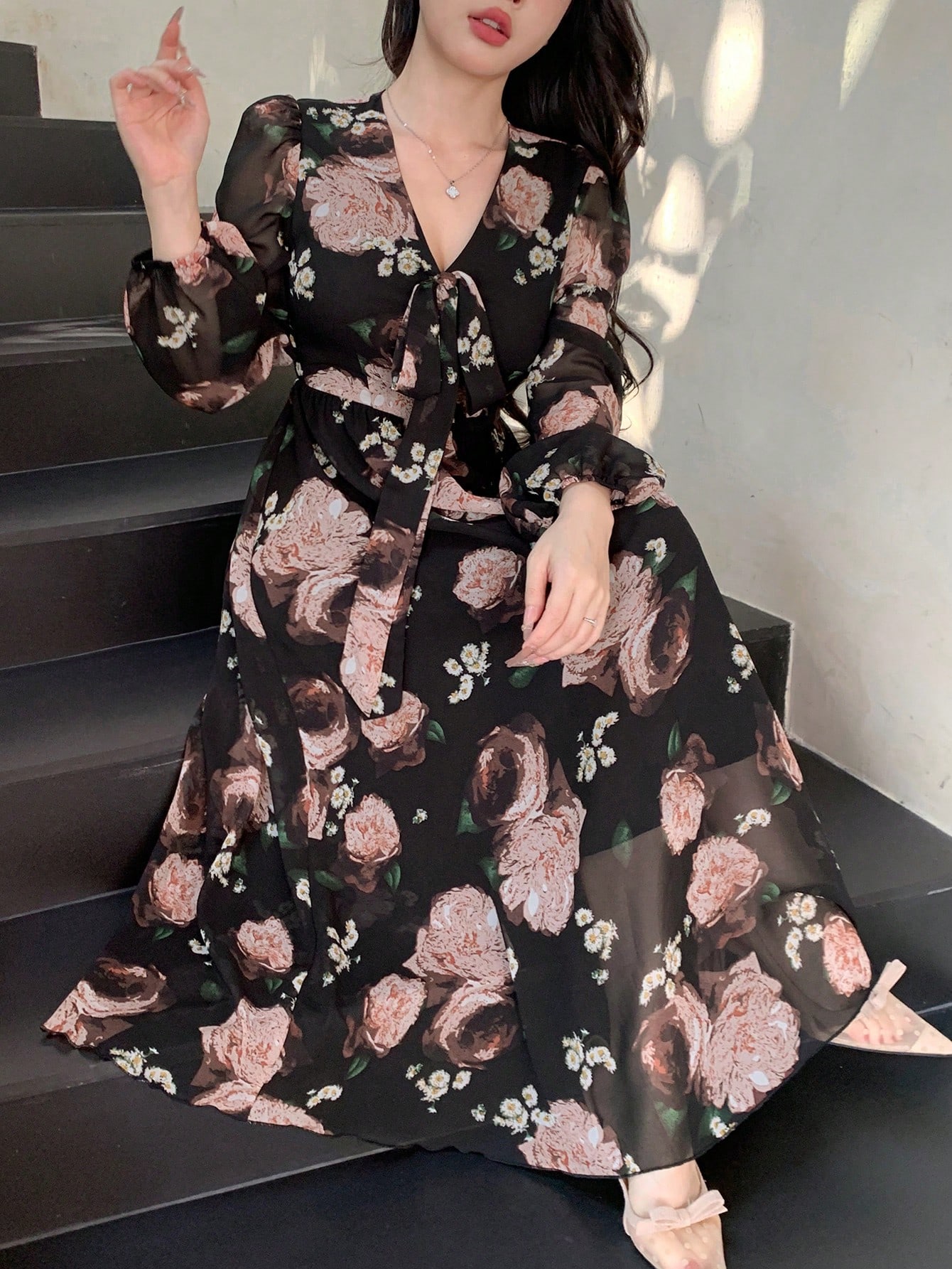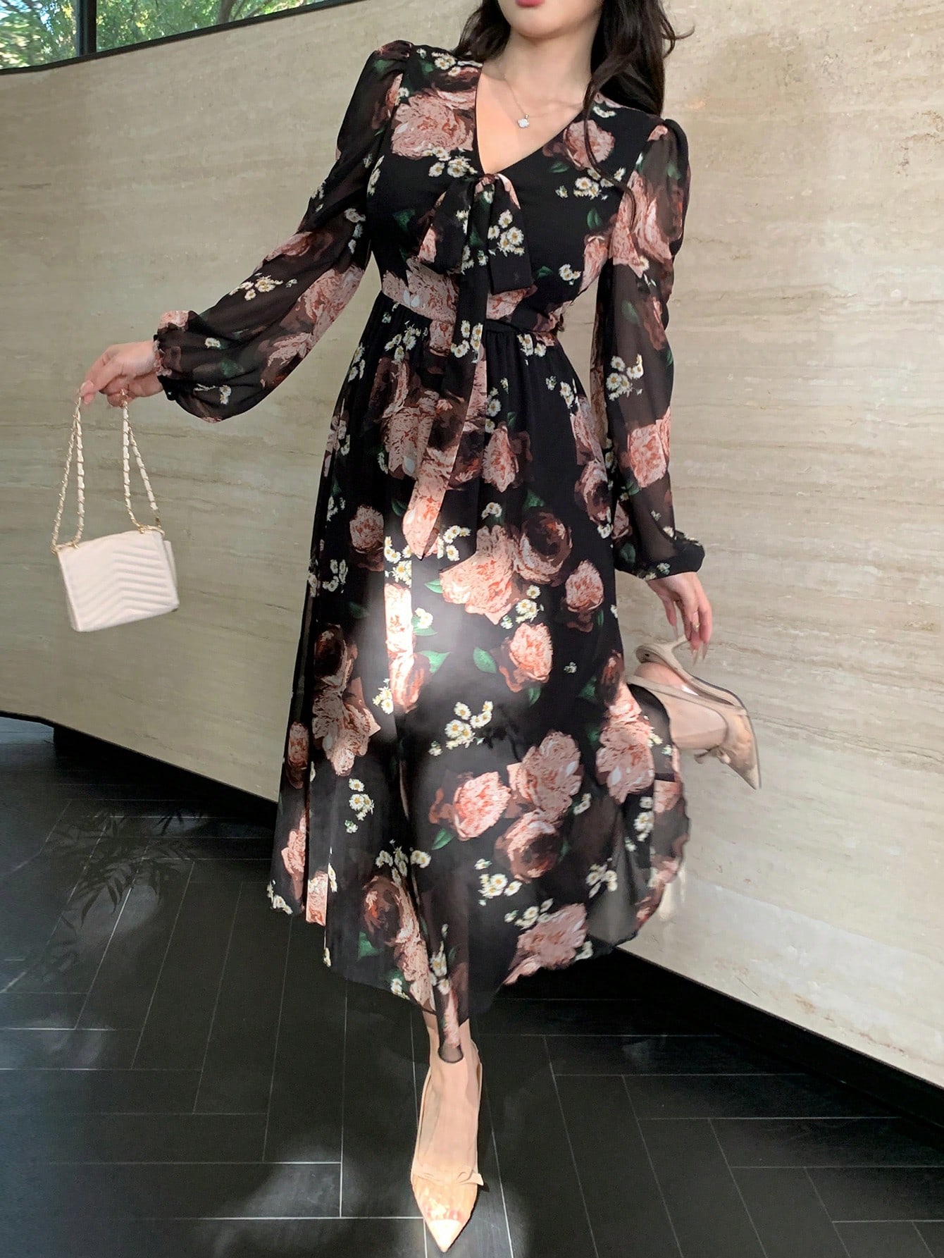 /فساتين سهرة ومناسبات/DAZY فستان طويل أنيق للنساء بطباعة زهور وياقة على شكل V وأكمام كيموني للموسم الخريفي الجديد رمضان