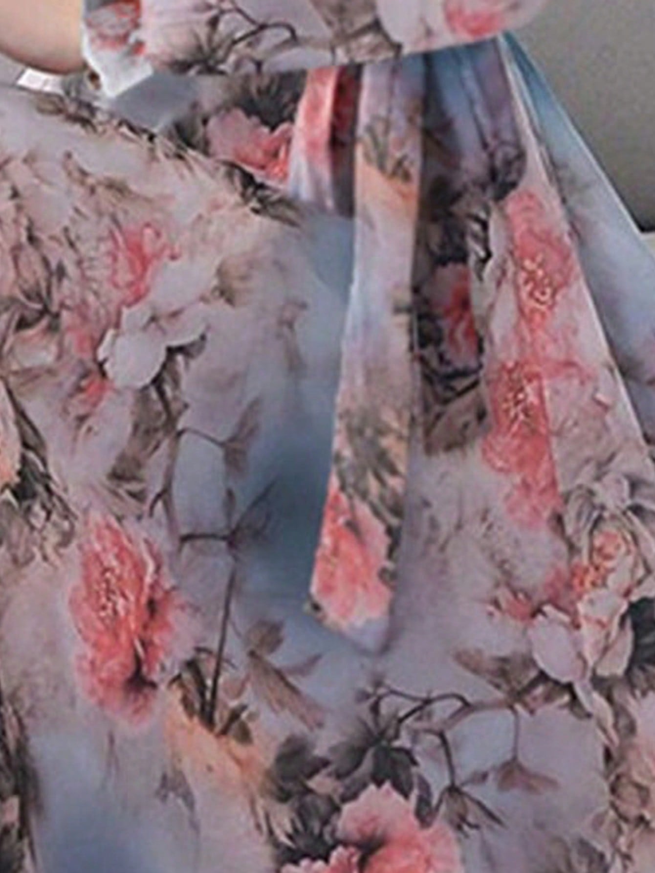 /فساتين سهرة ومناسبات/فستان نسائي طويل الأكمام مطبوع، تنورة طويلة مخصرة مرهفة الطبع، تنورة شيفون أنيقة مزهرة، فستان نسائي
