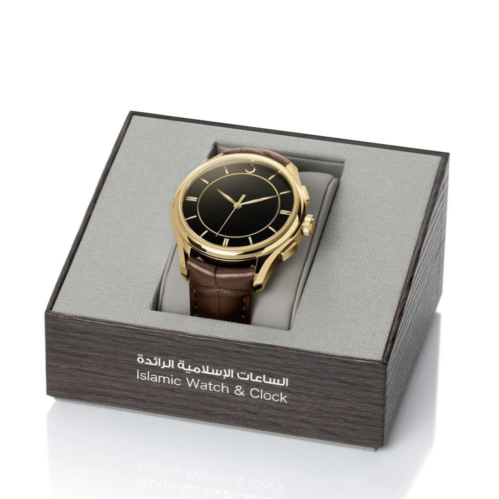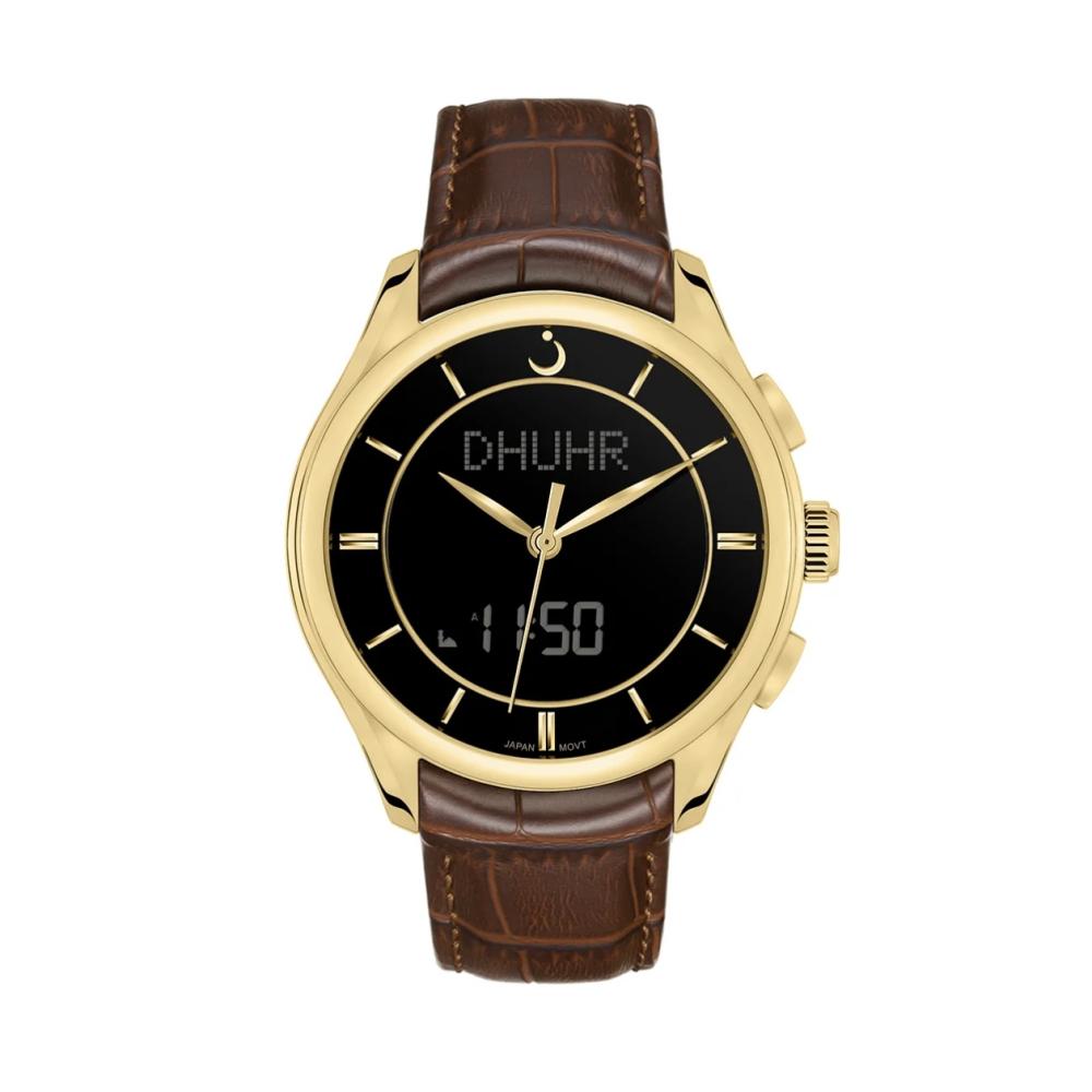 ساعة بريمير مزودة بتوقيت عقارب و رقمي متزامن تعرض التاريخ ومواقيت الصلاة، مصنوعة من فولاذ بدرجة 316، وزجاج من الياقوت المضاد للانعكاس، تاج رقمي، وحزام من الجلد الطبيعي.