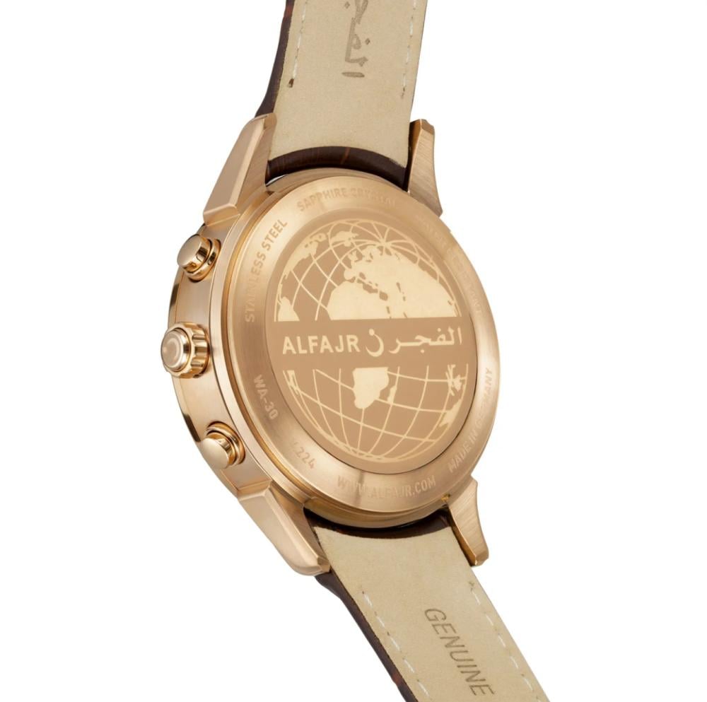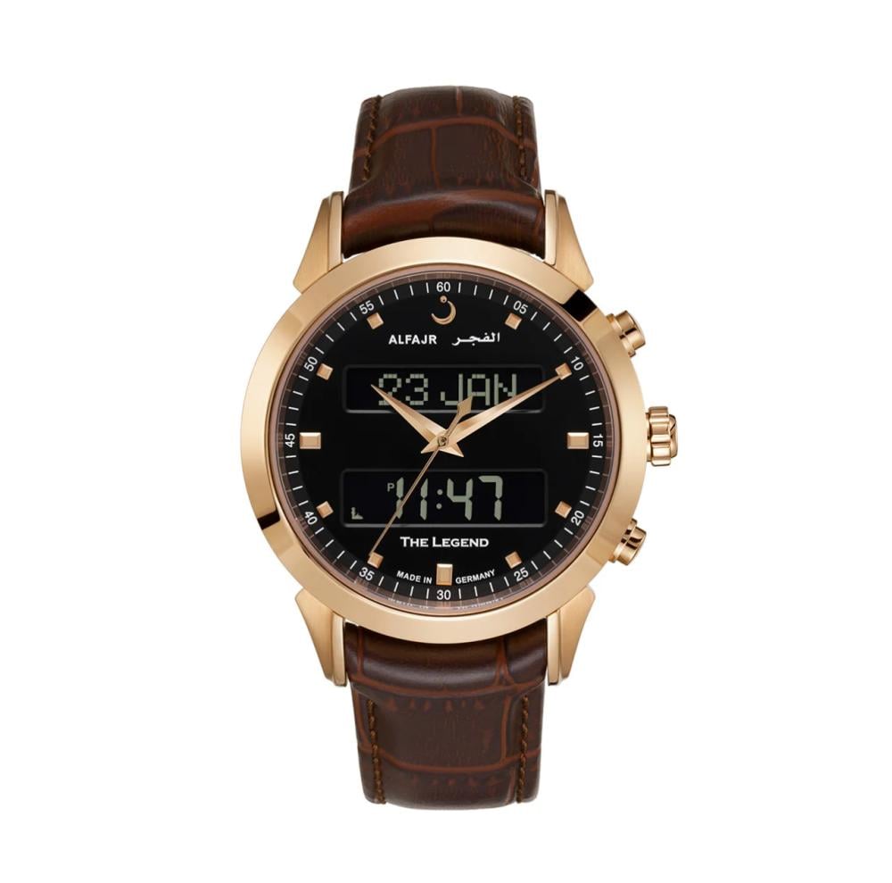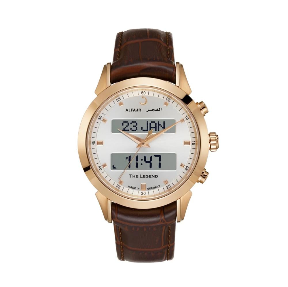 ساعة رجالية فاخرة مزودة بتوقيت مزدوج (عقارب ورقمي) تعرض التاريخ و مواقيت الصلاة. إطار من الفولاذ الصلب المصقول. زجاج من الياقوت المضاد للخدش. تاج متعدد المهام.وحزام من الجلد الطبيعي. الميناء والشاشة البلورية. يتوفران باللون الأبيض أو الأسود.