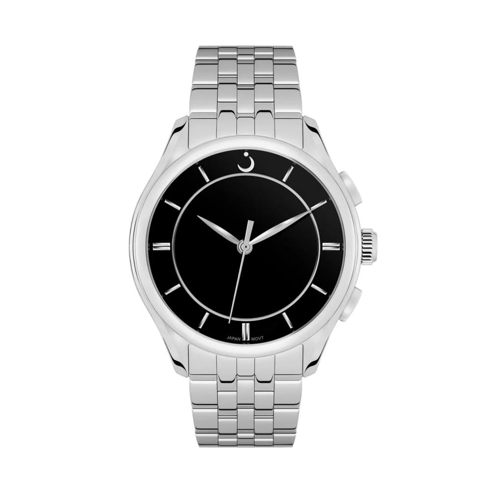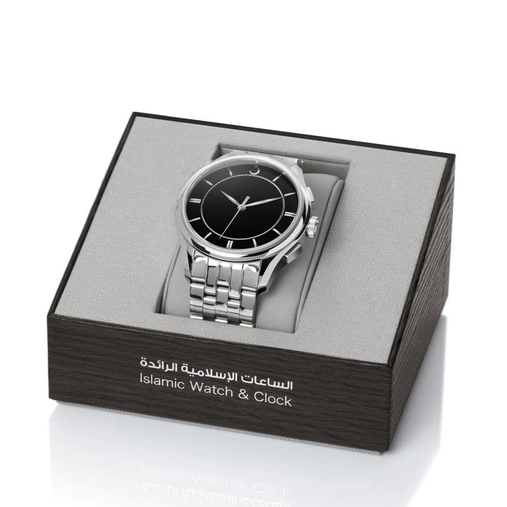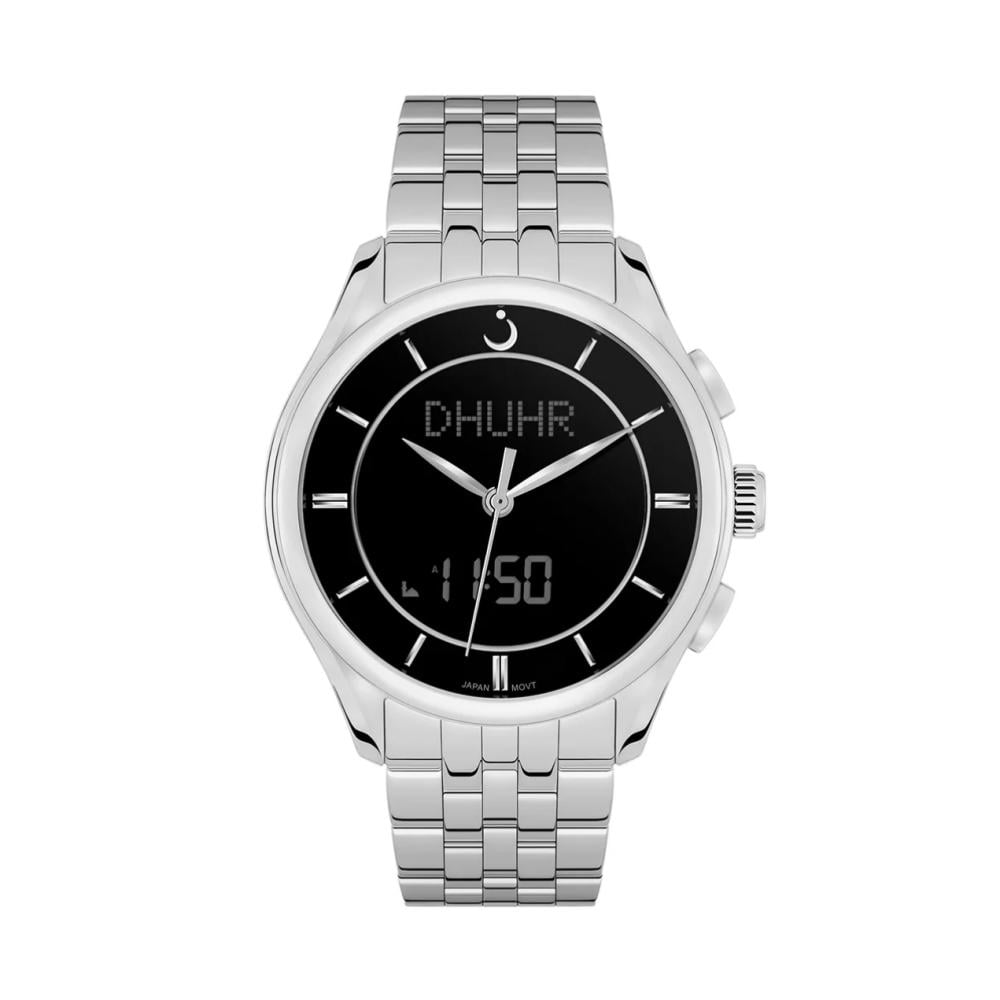 ساعة بريمير مزودة بتوقيت عقارب و رقمي متزامن تعرض التاريخ ومواقيت الصلاة، مصنوعة من فولاذ بدرجة 316، وزجاج من الياقوت المضاد للانعكاس، تاج رقمي، وحزام من الفولاذ المقاوم للصدأ.