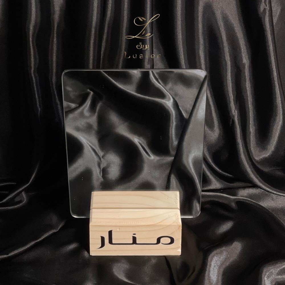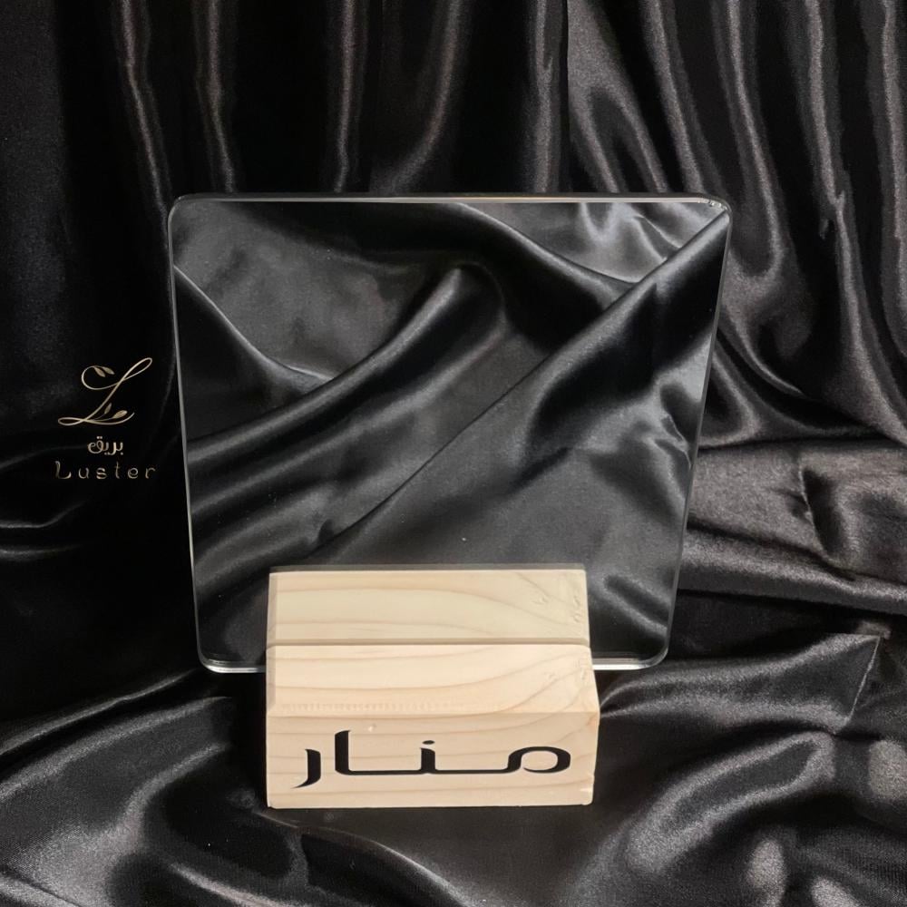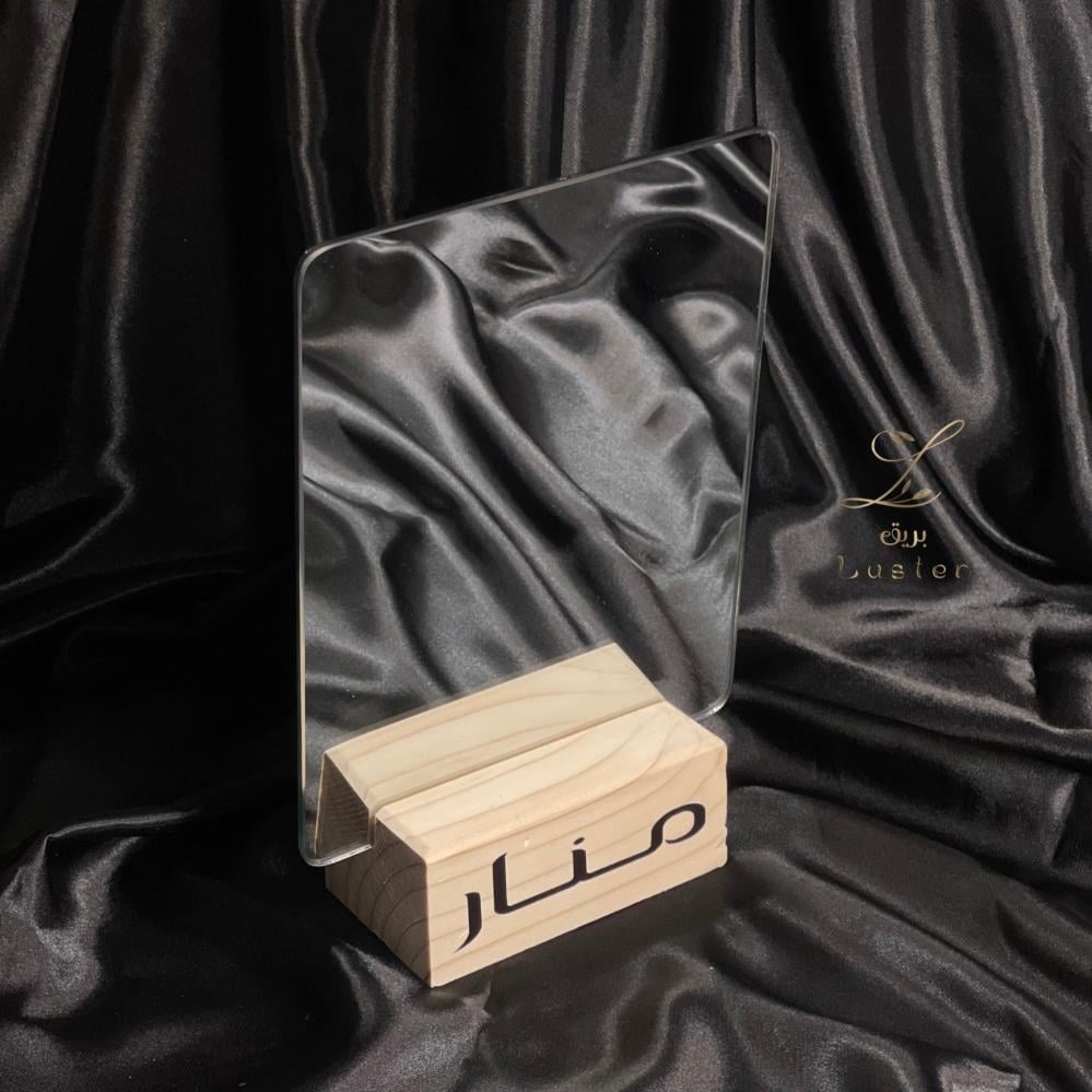 مرآة بقاعدة خشب مع امكانية كتابة الاسم او عبارة على حسب الطلب