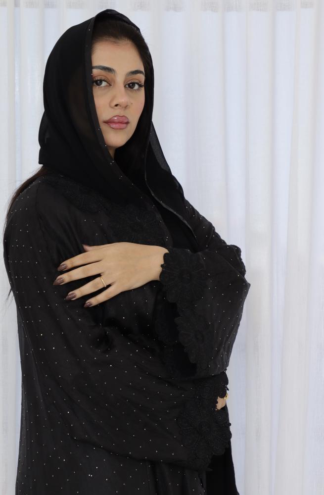 **عباية فاخرة كريستال مع كلفة ورود ، تتميز بلمستها الناعمة ومظهرها الأنيق. مُزينة بكلفة بالاكمام ومن الامام يضفي عليها طابعًا راقيًا.